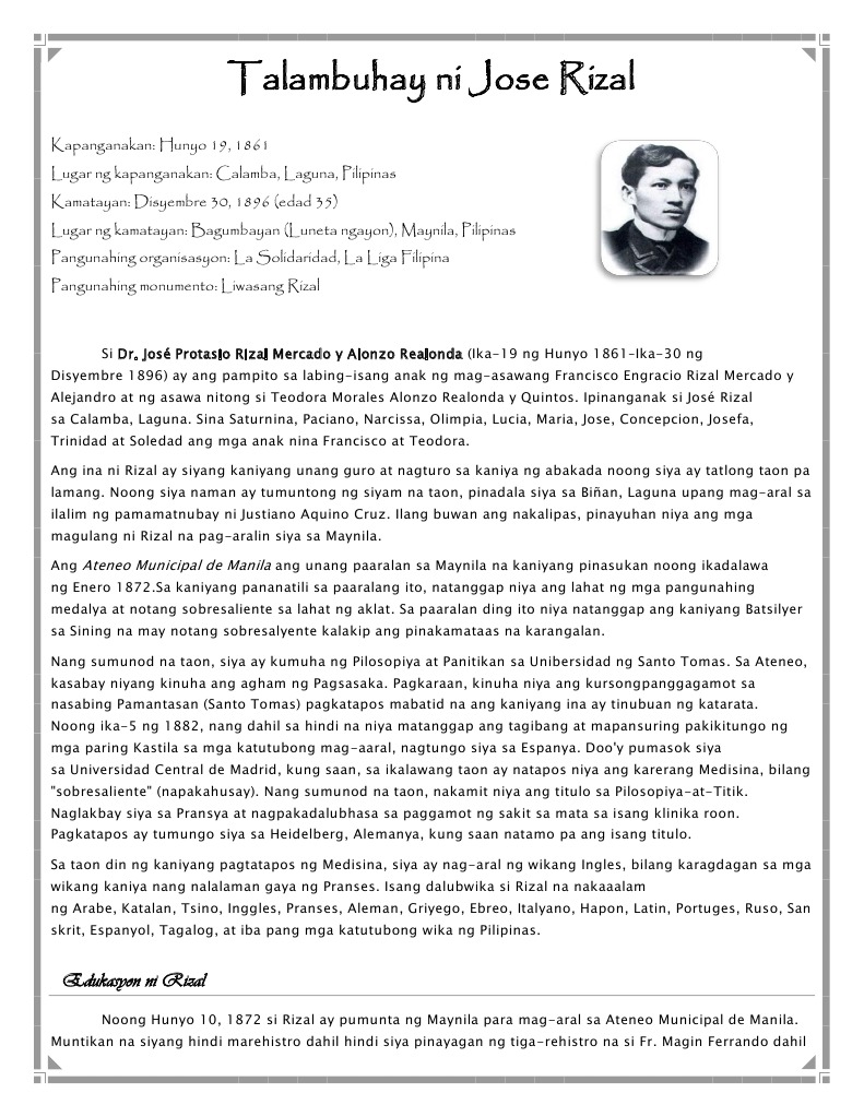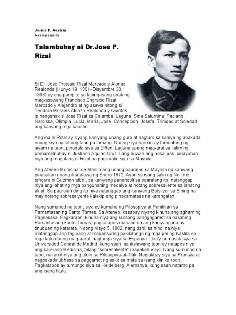 Ang talambuhay ni rizal - Ang buong pangalan ng ating bayani ay Dr. Jose Protasio Rizal Mercado y - Studocu