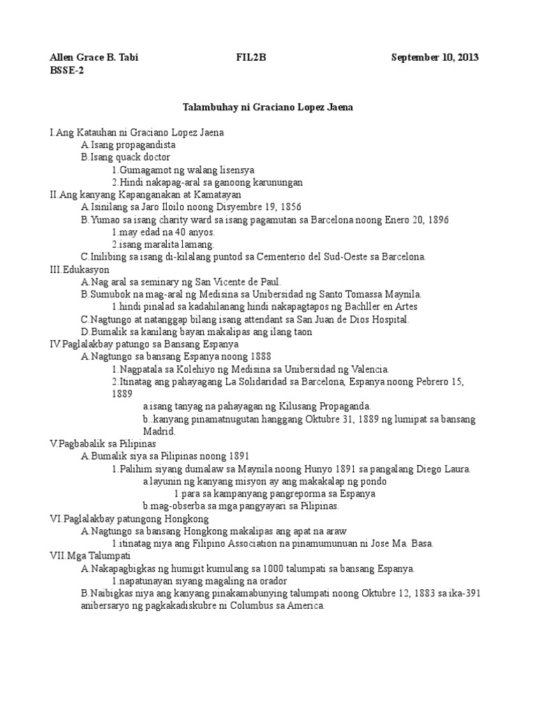 Balangkas NG Talambuhay Ni Graciano Lopez Jaena | PDF