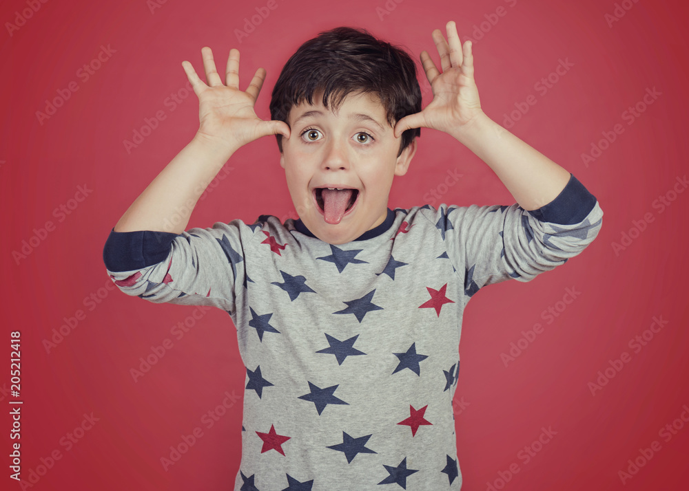 Niño gracioso que saca la lengua sobre fondo rojo Stock Photo | Adobe Stock
