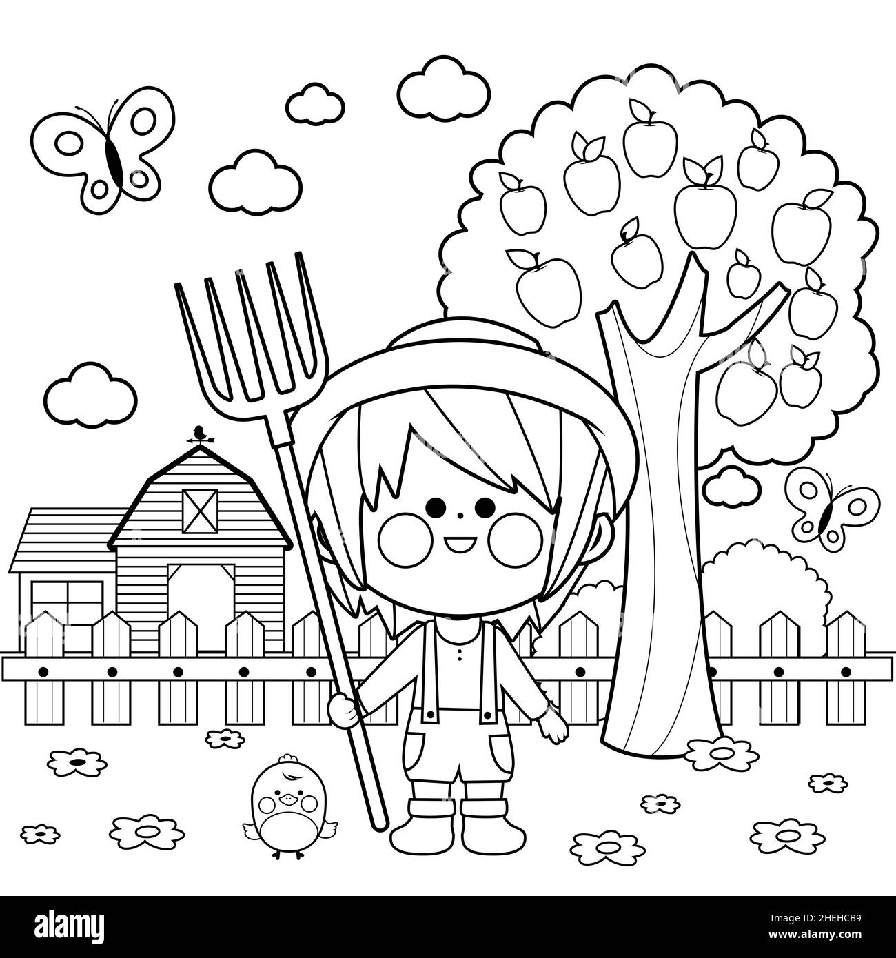 Pequeño granjero chico en la granja. Página para colorear en blanco y negro Fotografía de stock - Alamy