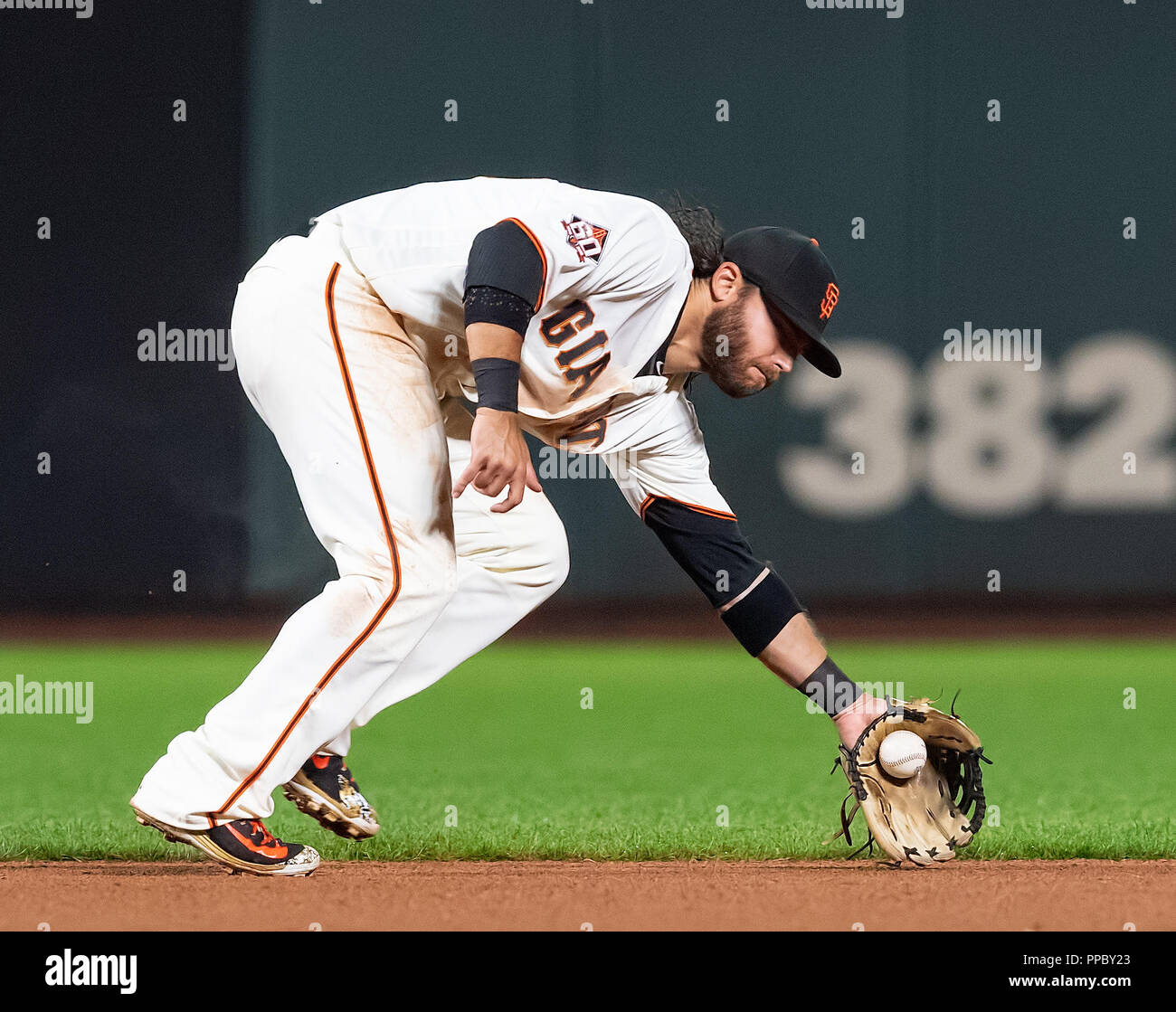 San Francisco, California, EEUU. 24 Sep, 2018. San Francisco Giants shortstop Brandon Crawford (35) obtiene su guante en un infield hit, durante un juego MLB entre los San Diego Padres y los