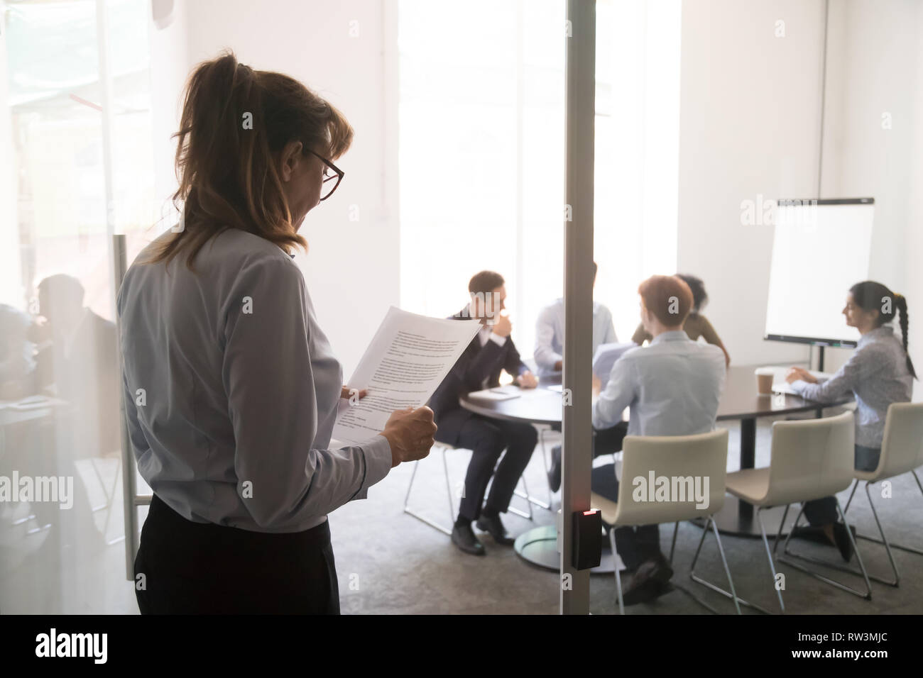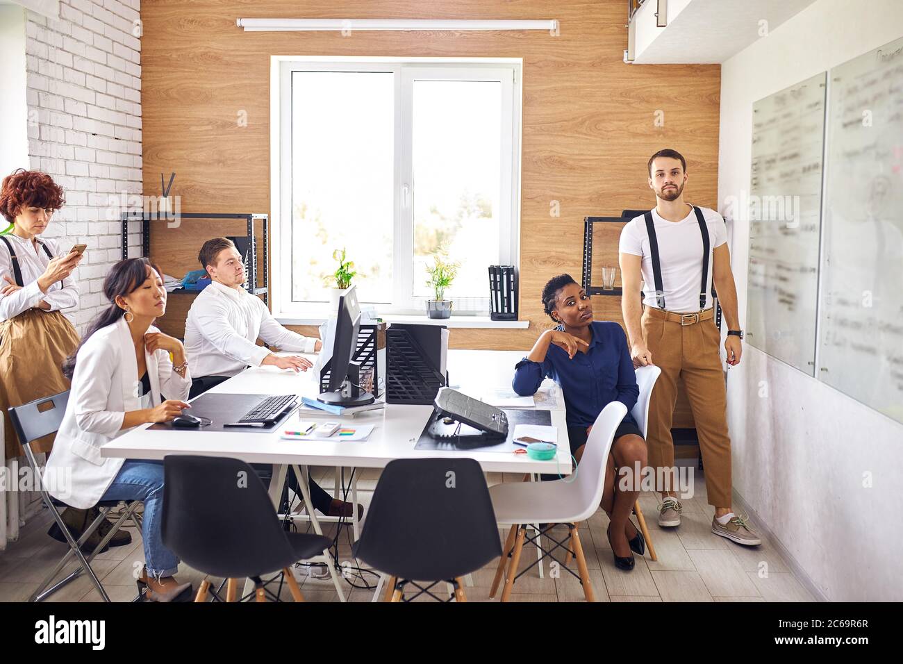 Grupo internacional de compañeros de trabajo en reunión de negocios con un líder caucásico confiado. Multietnicidad. Concepto de liderazgo y ambición, hablar en público Fotografía de stock - Alamy