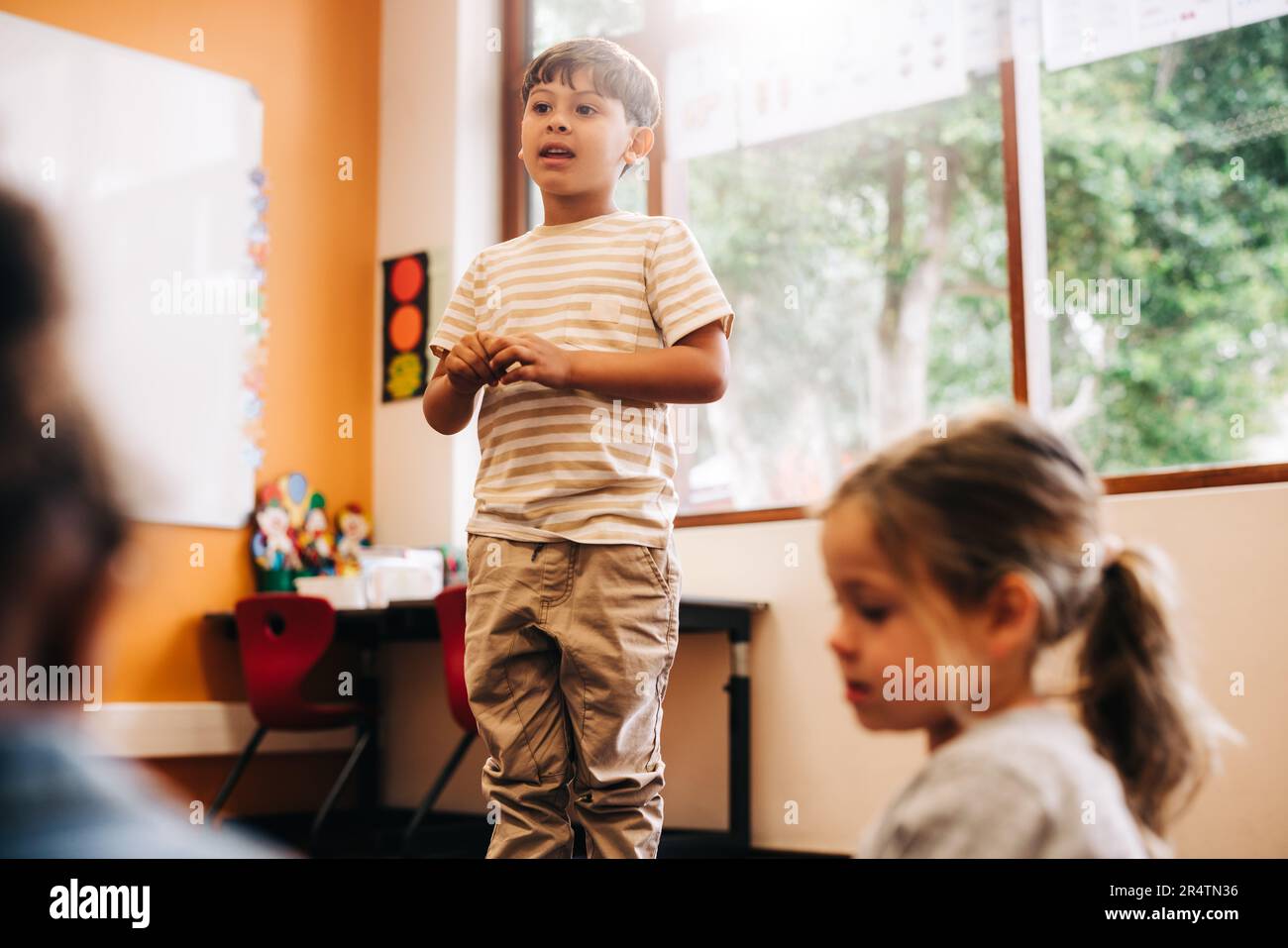 El niño confiado se para frente a su clase para dar un discurso en una clase de idiomas. El alumno masculino de la escuela primaria desarrolla su habilidad de hablar en público
