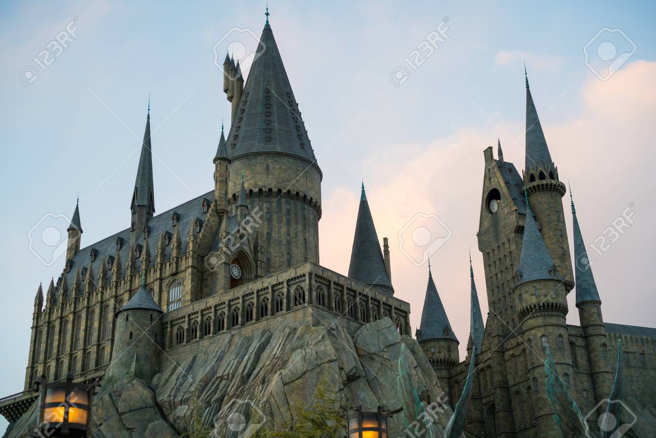 OSAKA, JAPÓN - Enero 14,2017: Castillo De Hogwarts De Películas De Harry Potter De Cerca En La Noche Fotos, retratos, imágenes y fotografía de archivo libres de derecho. Image 91925851