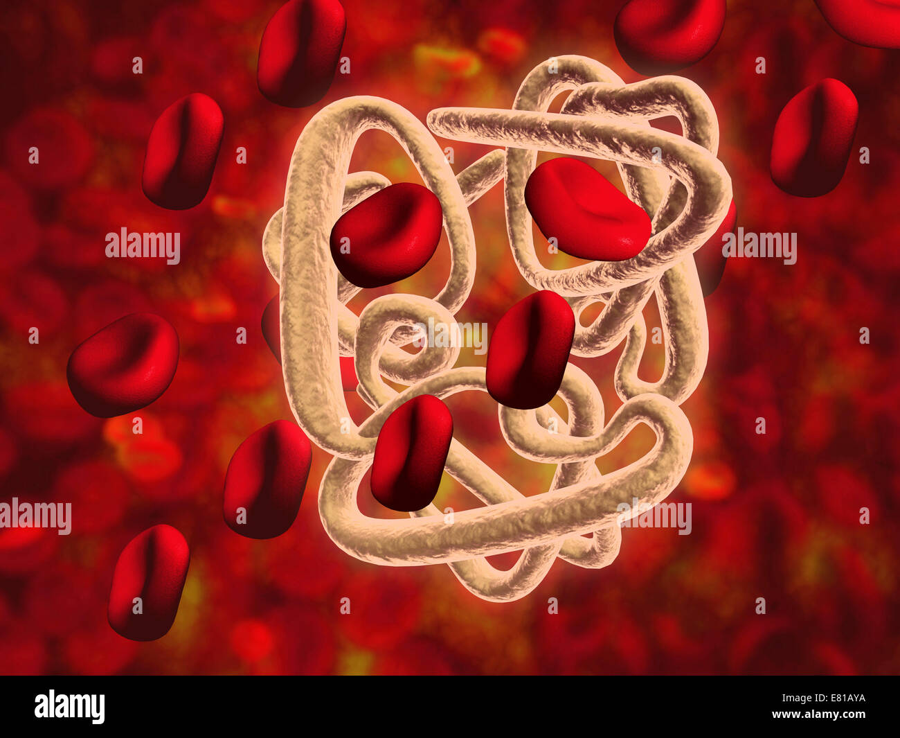 La hemoglobina en los glóbulos rojos de la sangre. Ilustración de glóbulos rojos (eritrocitos) con un modelo de transporte de oxígeno de la molécula de hemoglobina. Es esta molécula Fotografía de stock -
