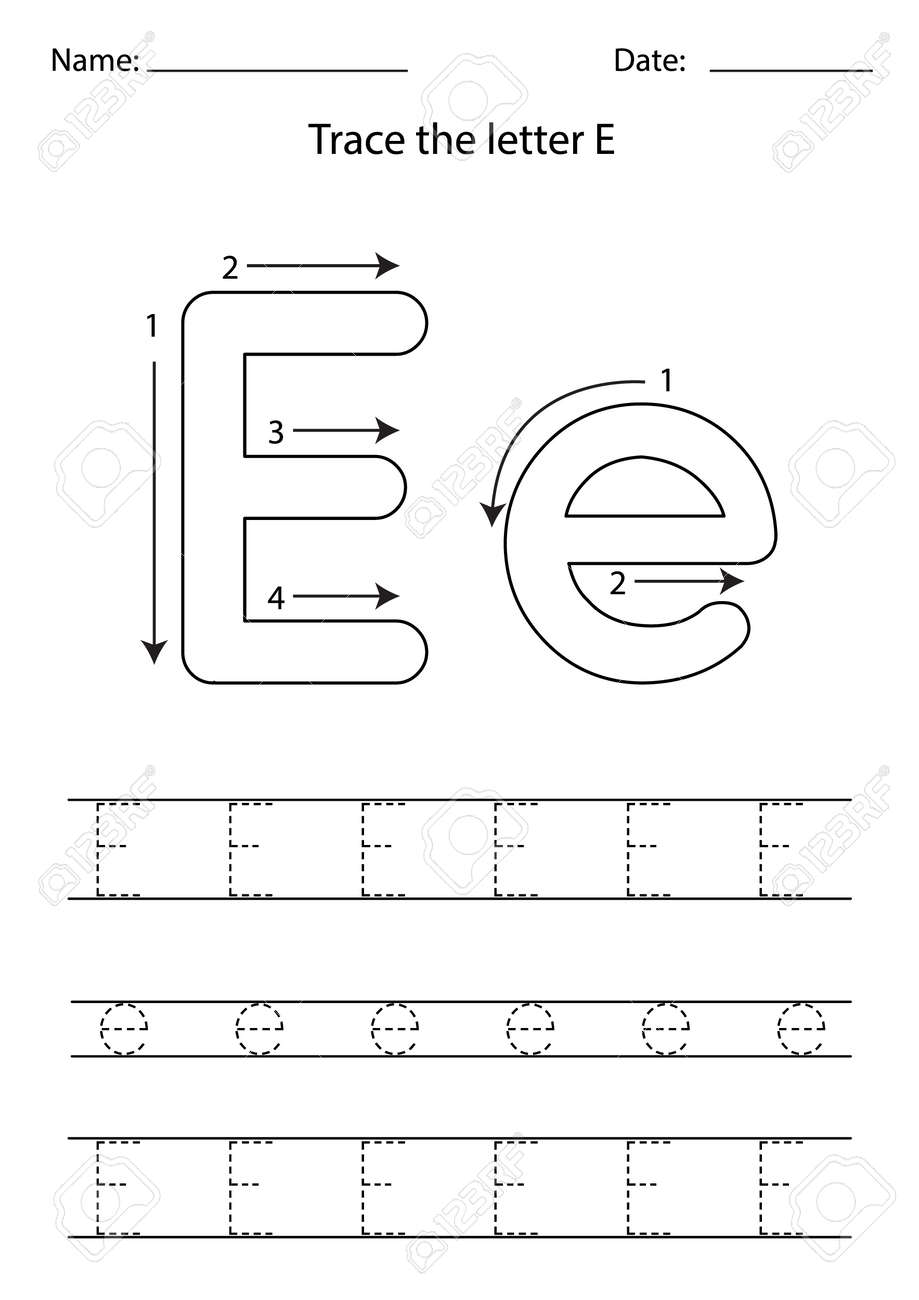 Letra E. conjunto de hojas de trabajo de práctica de rastreo. Página de actividad del alfabeto de aprendizaje Imagen Vector de stock - Alamy