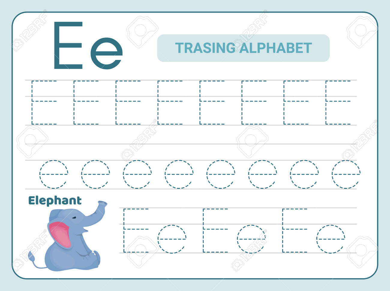 Práctica De Rastreo Del Alfabeto Letra E. Hoja De Trabajo De Práctica De Rastreo. Página De Actividades De Aprendizaje Del Alfabeto. Ilustraciones svg, vectoriales, clip art vectorizado libre de derechos. Image 162972346