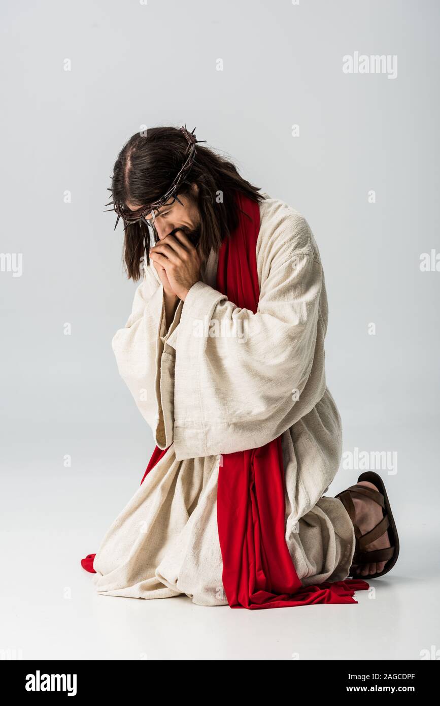 Hombre Barbado en corona rezando arrodillado sobre gris Fotografía de stock - Alamy