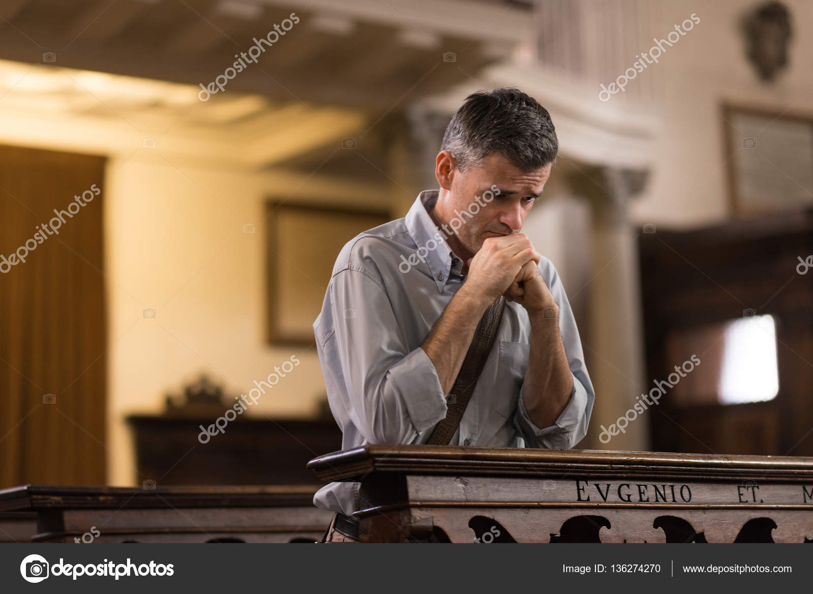Fotografía de Hombre arrodillado orando en Misa — Cathopic