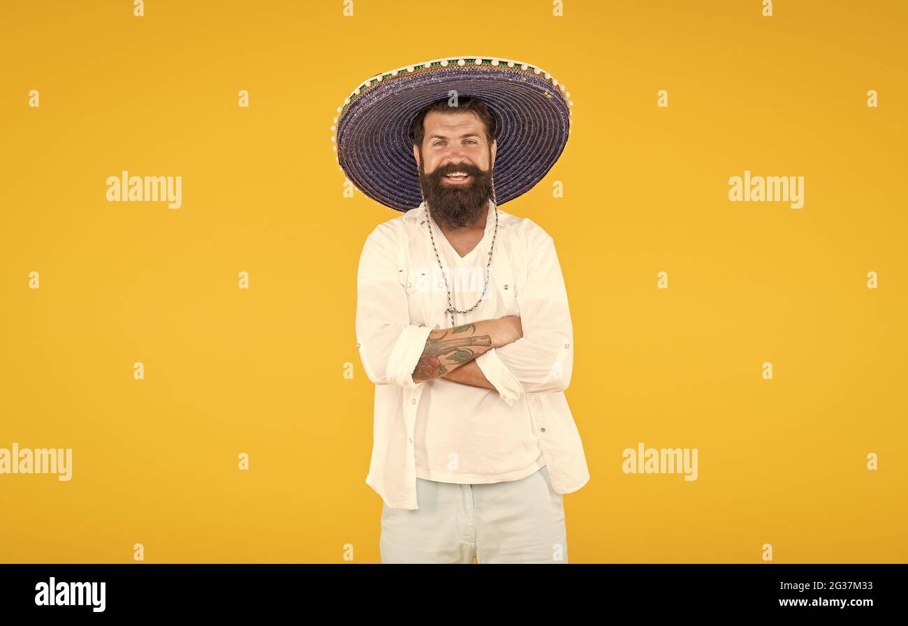 Hombre con sombrero de sombrero mexicano. concepto de vacaciones en el complejo en méxico. hipster con barba parece festivo en sombrero. feliz hombre brutal celebrando fiesta Fotografía de stock - Alamy