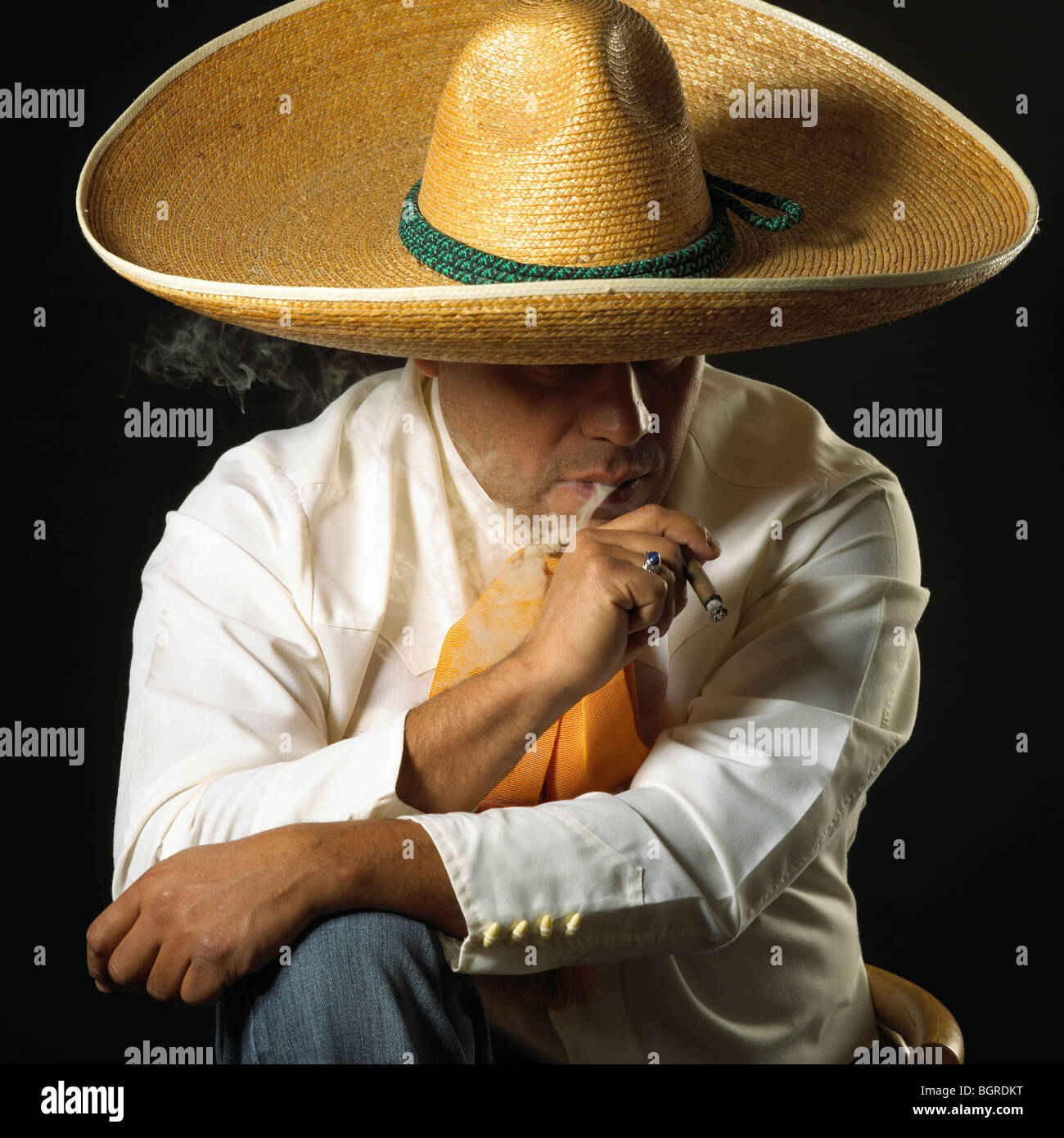Un hombre mexicano vestida con el tradicional sombrero, un sombrero, y fumar un cigarro Fotografía de stock - Alamy