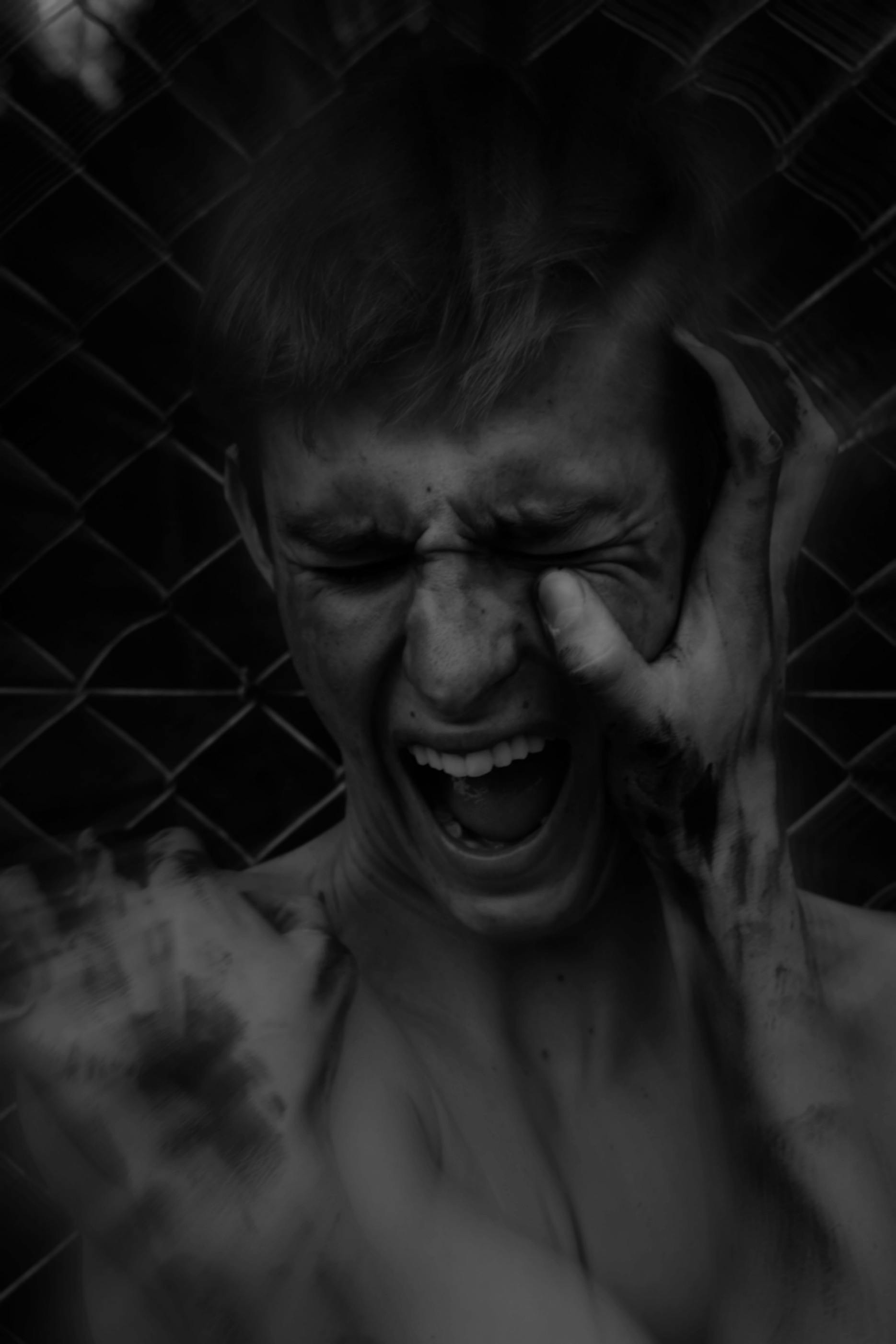 Foto de stock gratuita sobre asustado, fotos en blanco y negro, conceptual, emociones, expresión facial, gritando, gritos, hombre, joven, manos sucias, tiro vertical