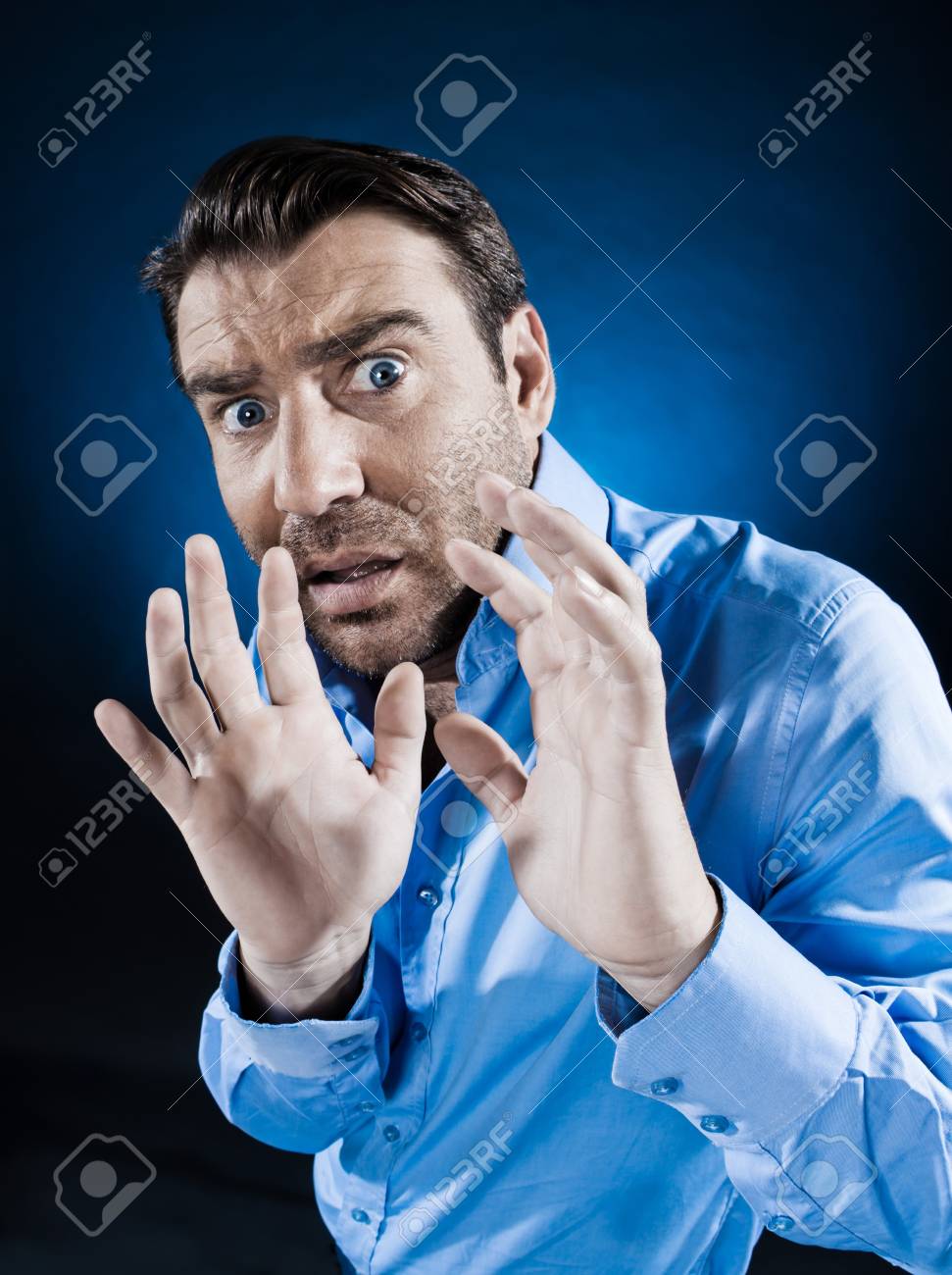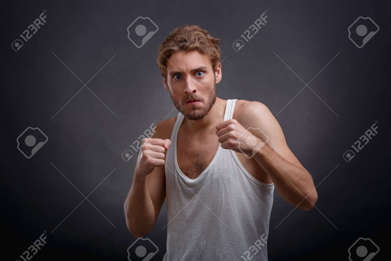 Un Hombre Asustado En Una Posición De Lucha Sobre Un Fondo Negro. Fotos, retratos, imágenes y fotografía de archivo libres de derecho. Image 90820524