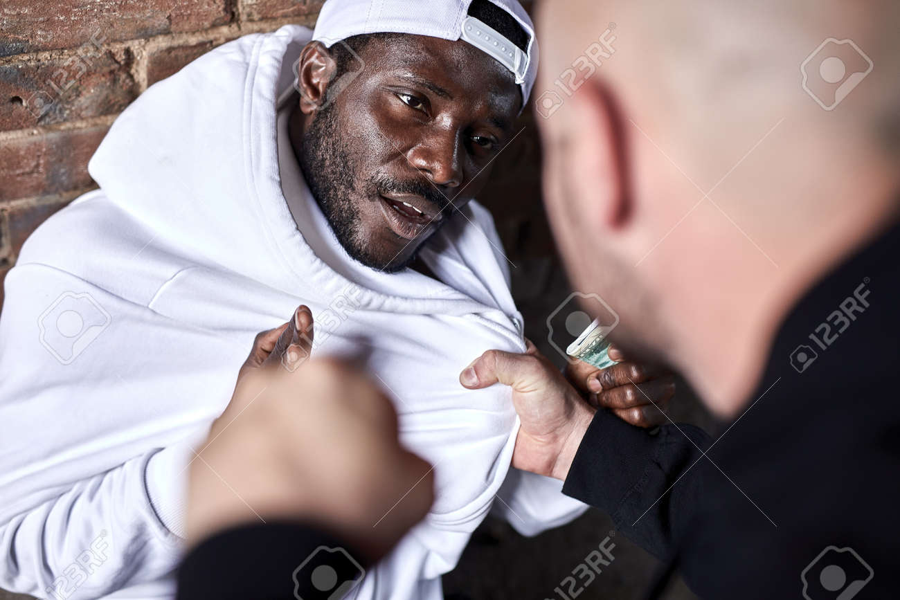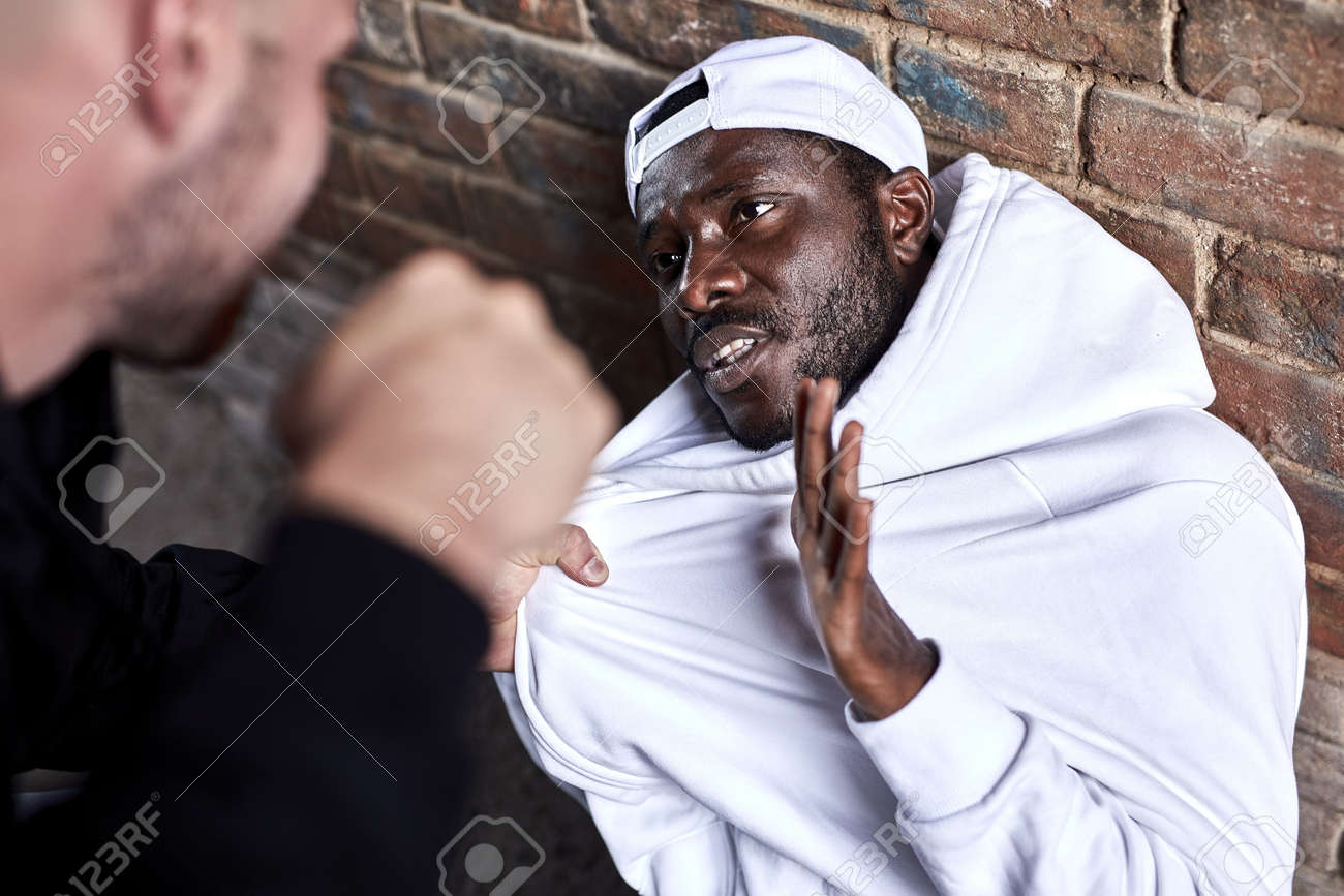 Actividad Delictiva, Adicción, Concepto De Problema Social. Hombre Afro Asustado Se Apoya En La Pared Amenazado Por Un Merodeador Caucásico Recortado, Exigiendo Dinero Y Otras Cosas Del Hombre Africano Negro Fotos, retratos,