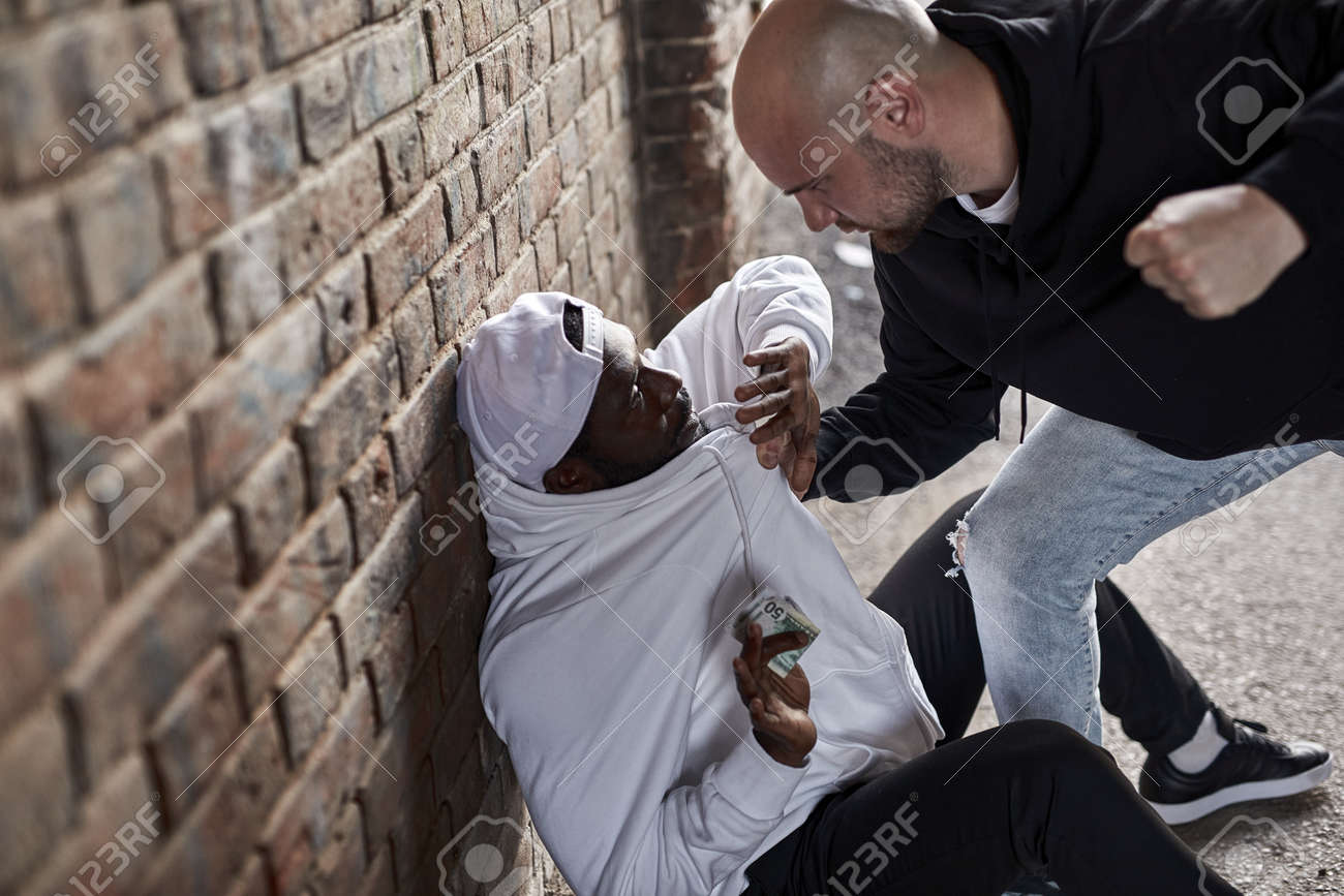 Bandido Roba A Hombre Africano. Un Hombre Caucásico Amenaza A Un Hombre Negro Asustado, Un Hombre Afroamericano Asustado Se Sorprende Sentado En El Suelo, Dando Dinero. En La Calle. Agresión, Crimen, Concepto