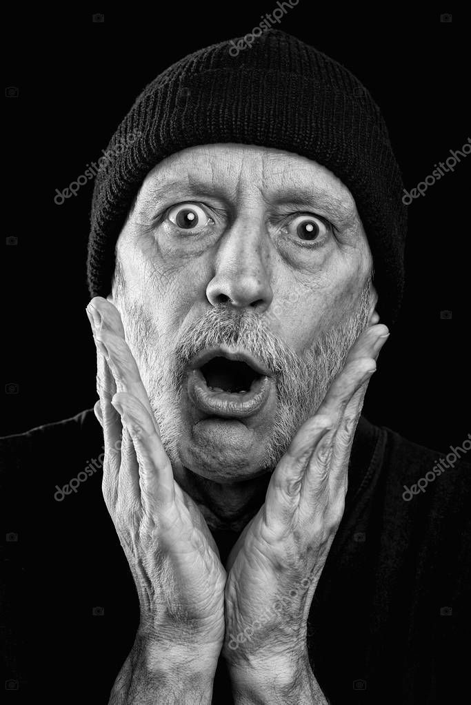 Hombre maduro asustado sobre fondo negro Fotografía de stock - Alamy