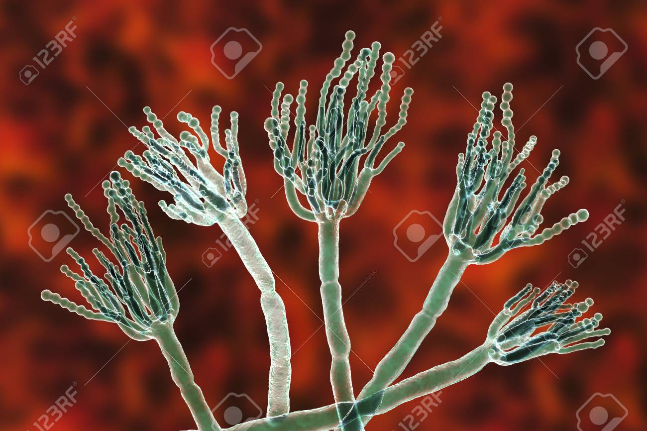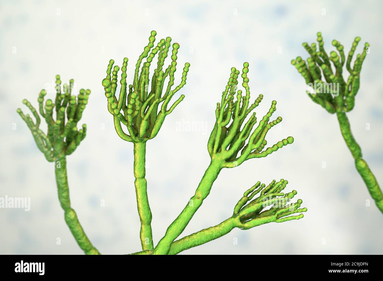 Hongos Penicillium Que Provocan El Deterioro De Los Alimentos Y Se Utilizan Para La Producción Del Primer Antibiótico Penicilina. Ilustración 3D Que Muestra Esporas, Conidios Y Conidióforos Fotos, retratos, imágenes y fotografía