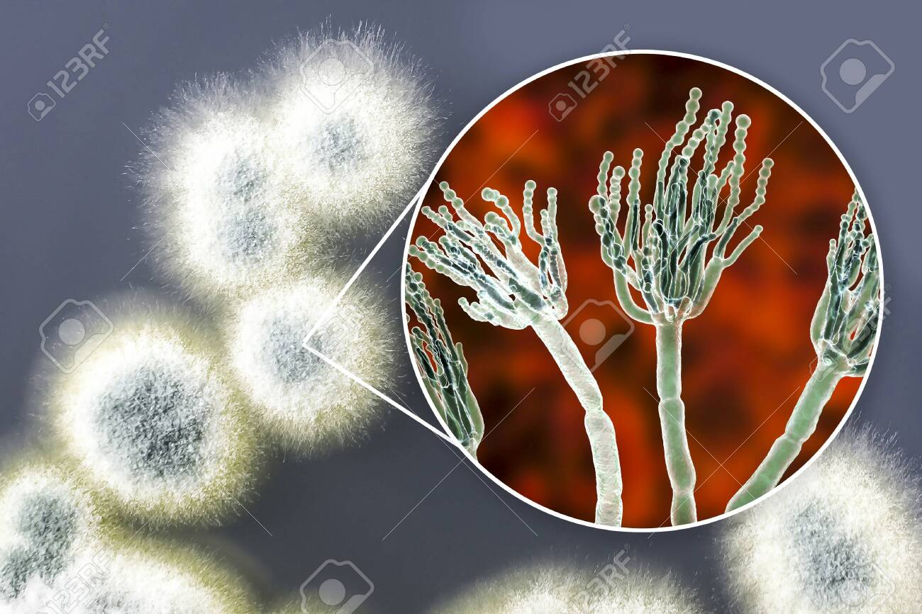 Hongos De Moho Penicillium, Ilustración 3D Y Fotografía De Colonias Cultivadas En Medio Nutritivo Fotos, retratos, imágenes y fotografía de archivo libres de derecho. Image 127986517