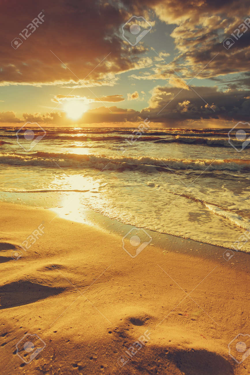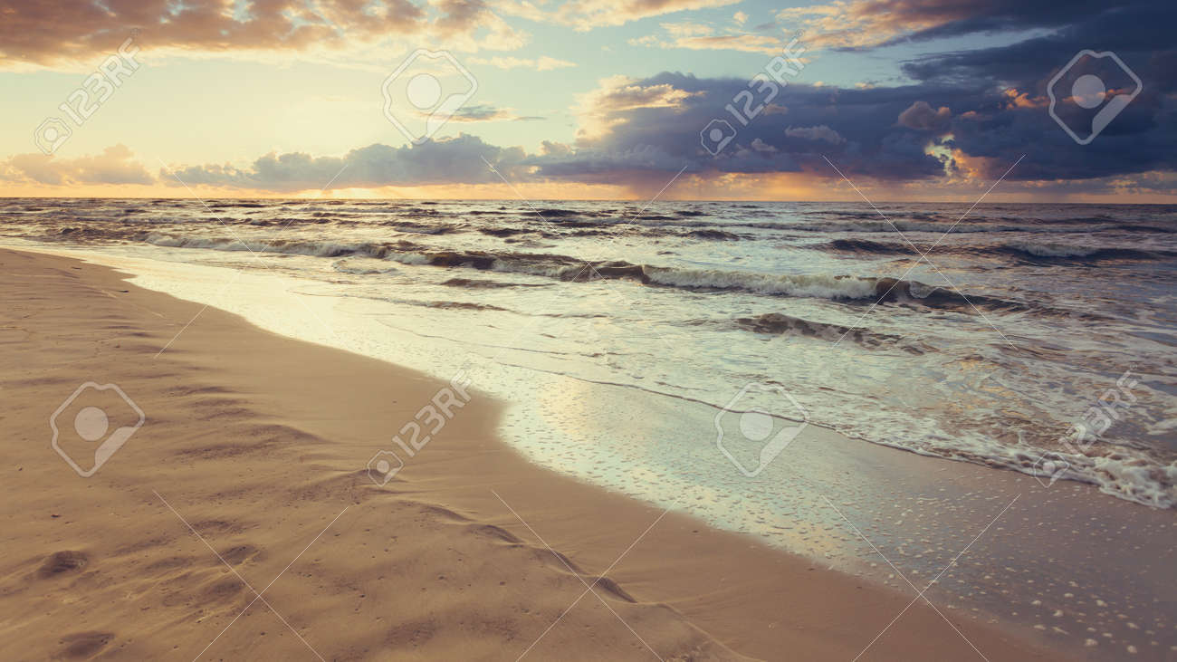 Colorido Impresionante Puesta De Sol Sobre El Horizonte De La Noche El Mar, El Cielo Y Las Nubes Playa De Arena. Escena Tranquila. Fondo Natural. Paisaje. Fotos, retratos, imágenes y fotografía de