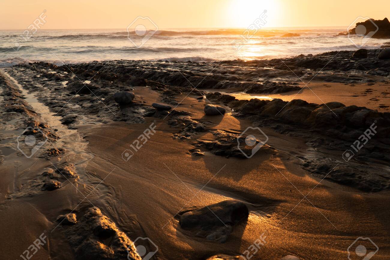 Rocas En La Playa Por La Noche, El Sol Se Esconde En El Horizonte, Al Norte De España Fotos, retratos, imágenes y fotografía de archivo libres de derecho. Image 163181396