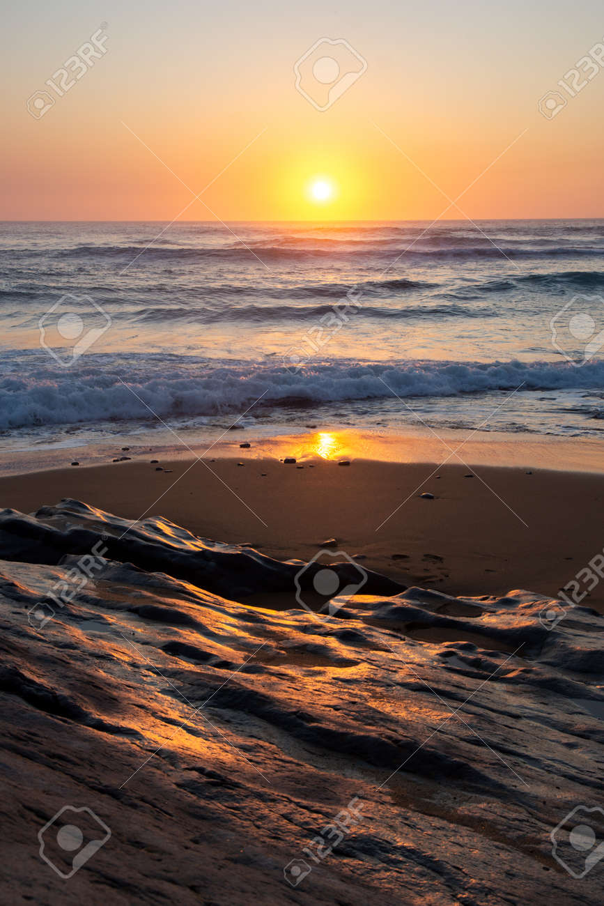 Rocas En La Playa Por La Noche, El Sol Se Esconde En El Horizonte, Al Norte De España Fotos, retratos, imágenes y fotografía de archivo libres de derecho. Image 150393046
