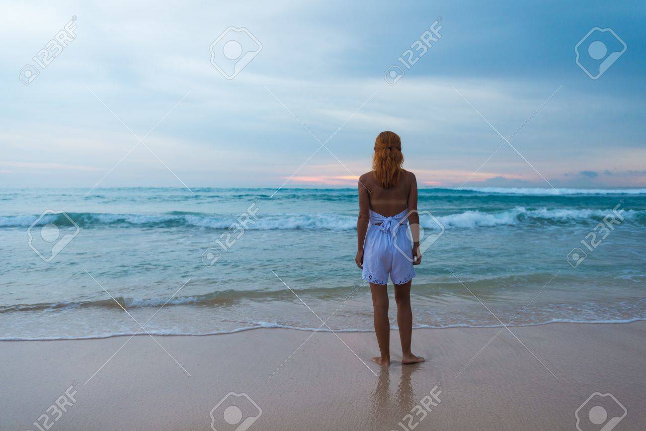 Mujer Joven En La Playa Del Océano Por La Noche Buscando En El Horizonte. Centrarse En El Océano Fotos, retratos, imágenes y fotografía de archivo libres de derecho. Image 58784511