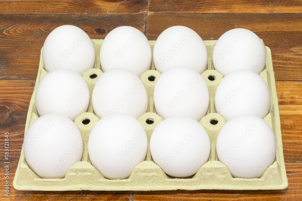 Una docena de huevos blancos en un envase de cartón, sobre una mesa de madera Stock Photo | Adobe Stock