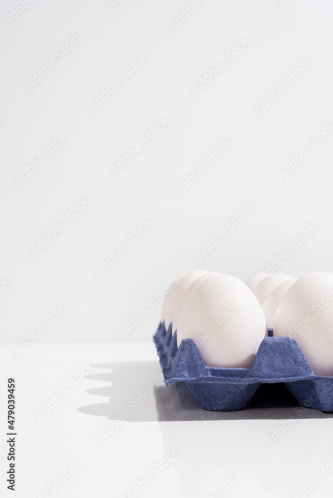 Una docena de huevos blancos de gallina en una huevera de cartón azul sobre una mesa blanca Stock Photo | Adobe Stock
