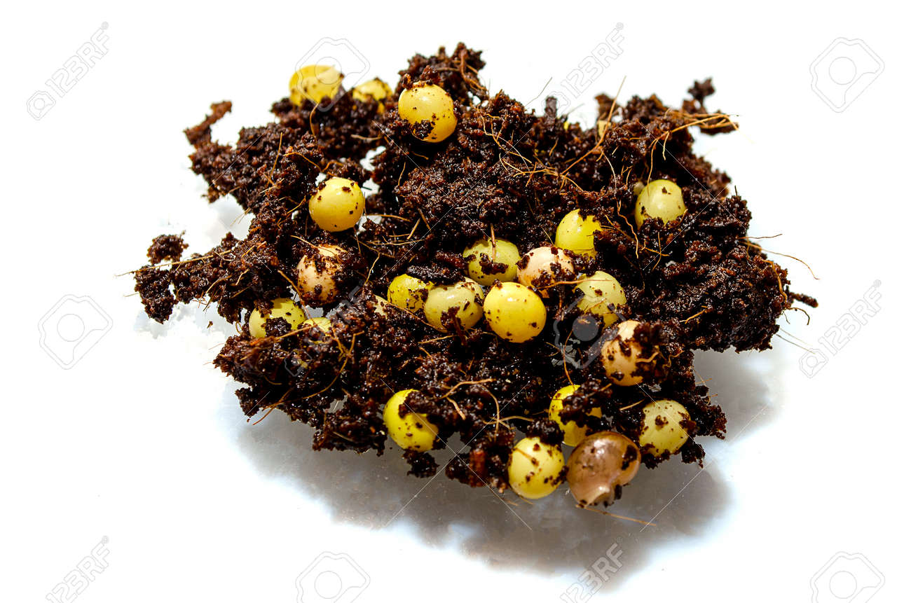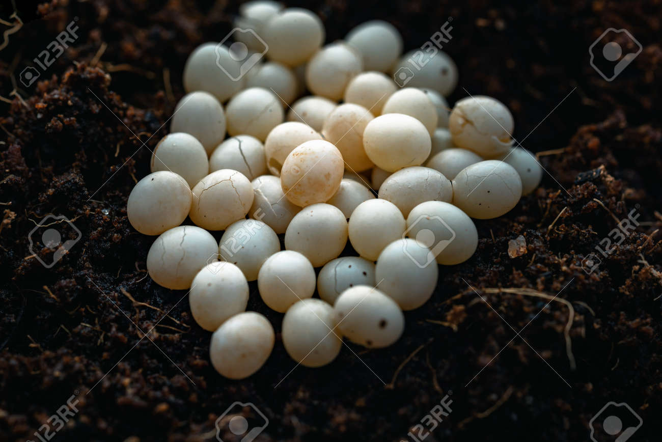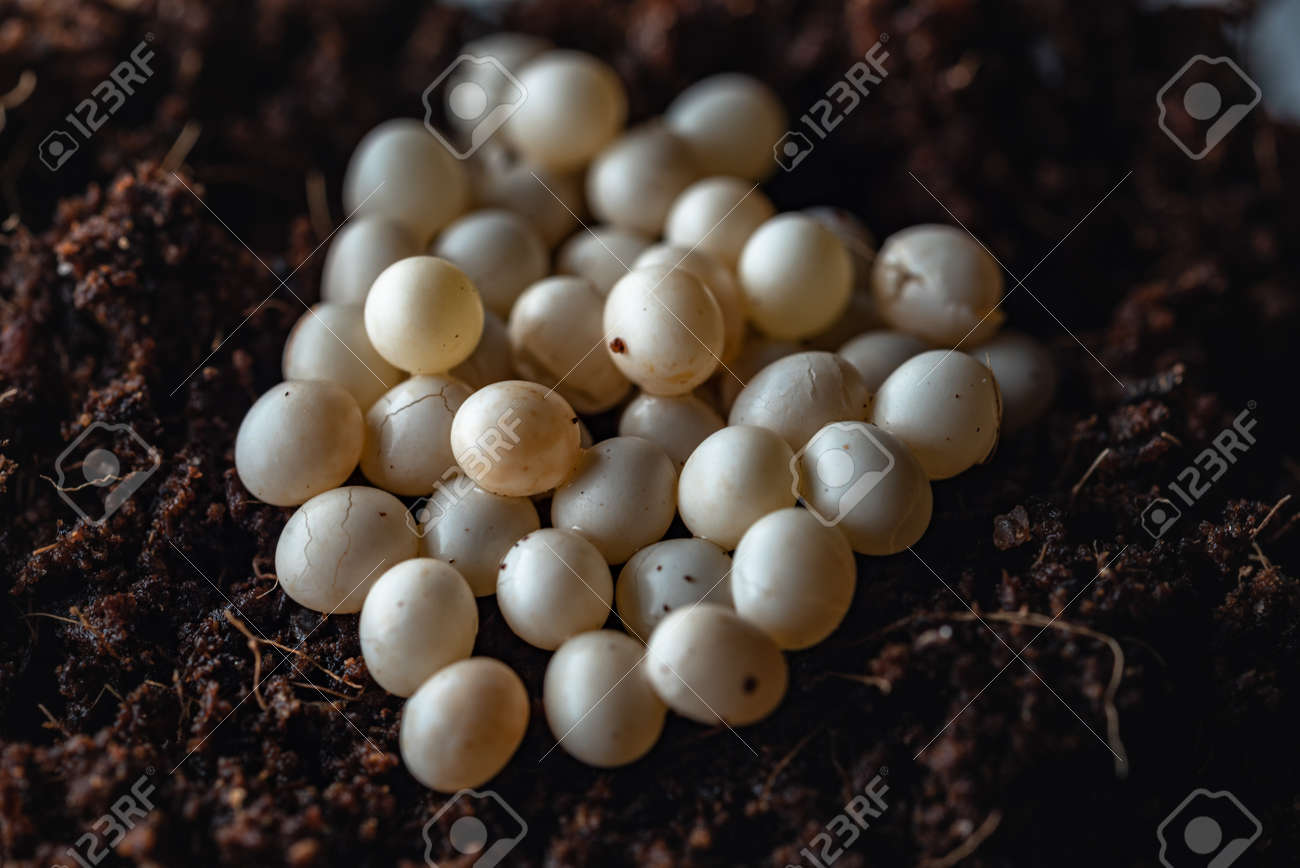 Achatina Snail White Eggs, Which Begin To Crack And Small Snails Hatch From There. Eggs In Coconut Substrate. Stock Photo, Picture and Royalty Free Image. Image 154782257.