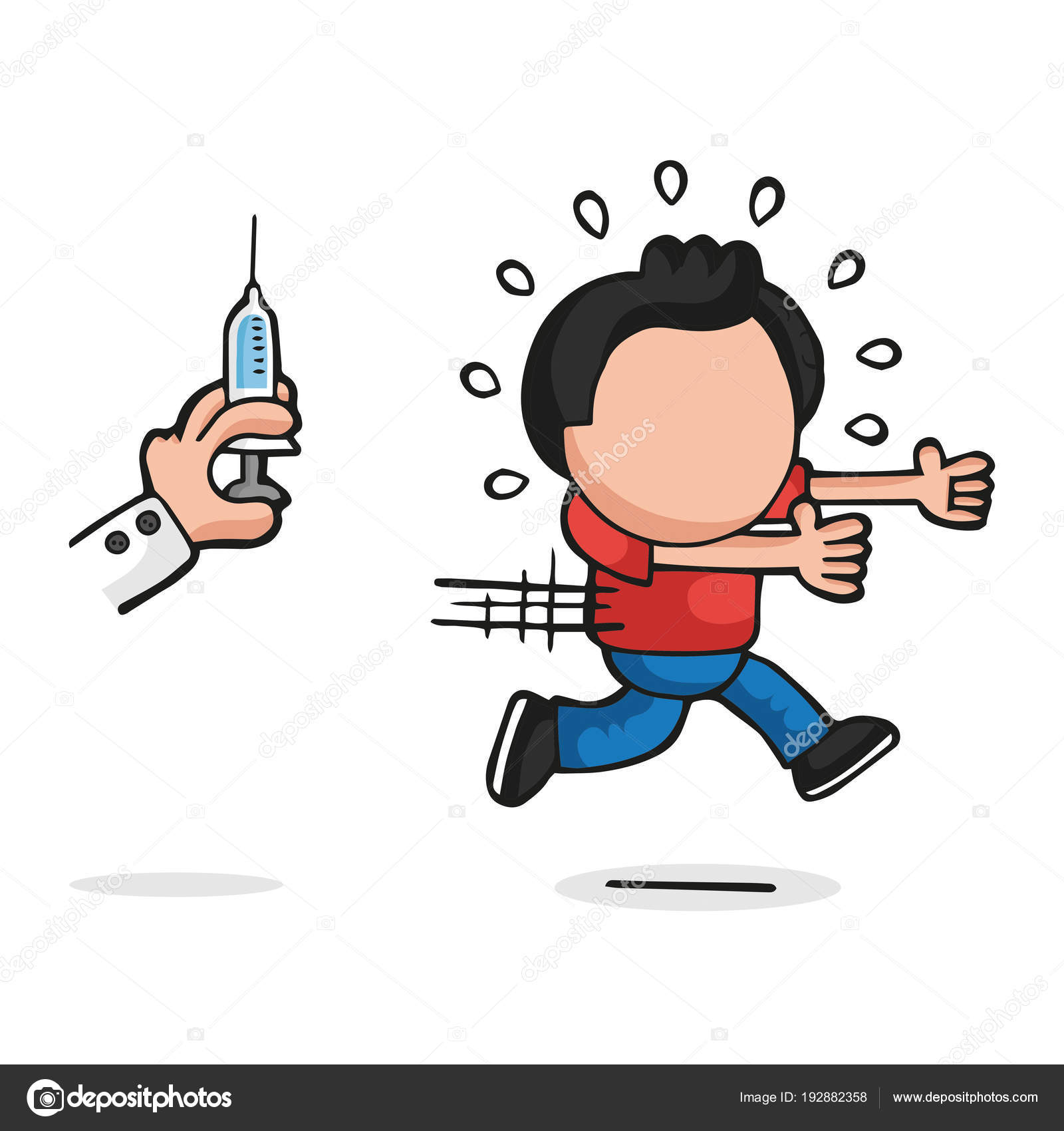Ilustración De Vector De Dibujos Animados Médico Hombre Con Estetoscopio Y Corriendo, Sosteniendo La Jeringa Lista Para La Inyección Y El Paciente Asustado Y Huyendo. Ilustraciones svg, vectoriales, clip art vectorizado libre