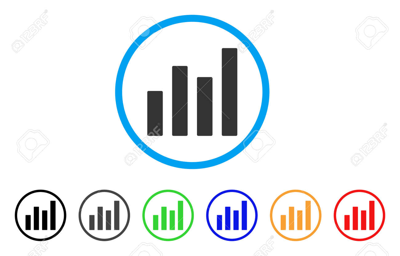Icono De Gráfico De Barras Redondeado. El Estilo Es Un Símbolo De Gráfico De Barra Plana Gris Dentro Del Círculo Azul Claro Con Versiones En Color Negro, Gris, Verde, Azul, Rojo, Naranja.