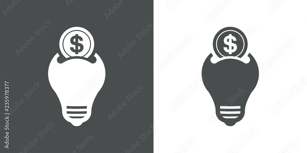 Icono plano bombilla led como hucha con moneda de dólar en gris y ...