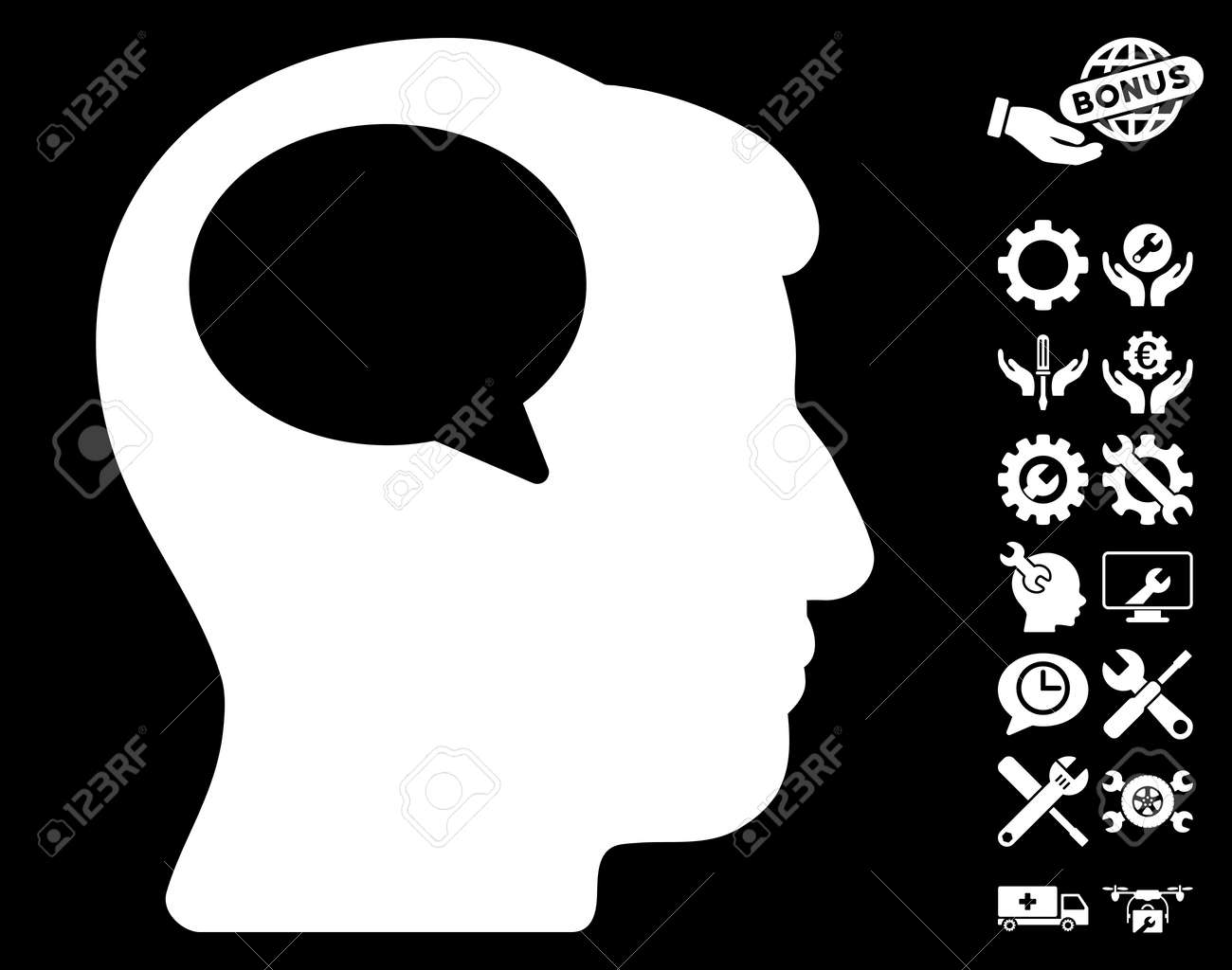 Icono De Persona Pensando Con Pictogramas De Configuración De Bonificación. El Estilo Del Ejemplo Del Glifo Es Símbolos Icónicos Planos En El Fondo Blanco. Fotos, retratos, imágenes y fotografía de archivo libres
