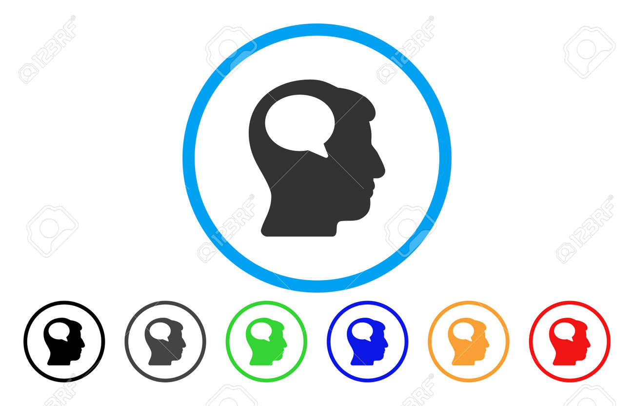 Persona Pensando Vector Icono Redondeado. El Estilo De La Imagen Es Un Símbolo Gris Plano Del Icono Dentro De Un Círculo Azul. Las Variantes De Color De Bonificación Son Gris, Negro, Azul,