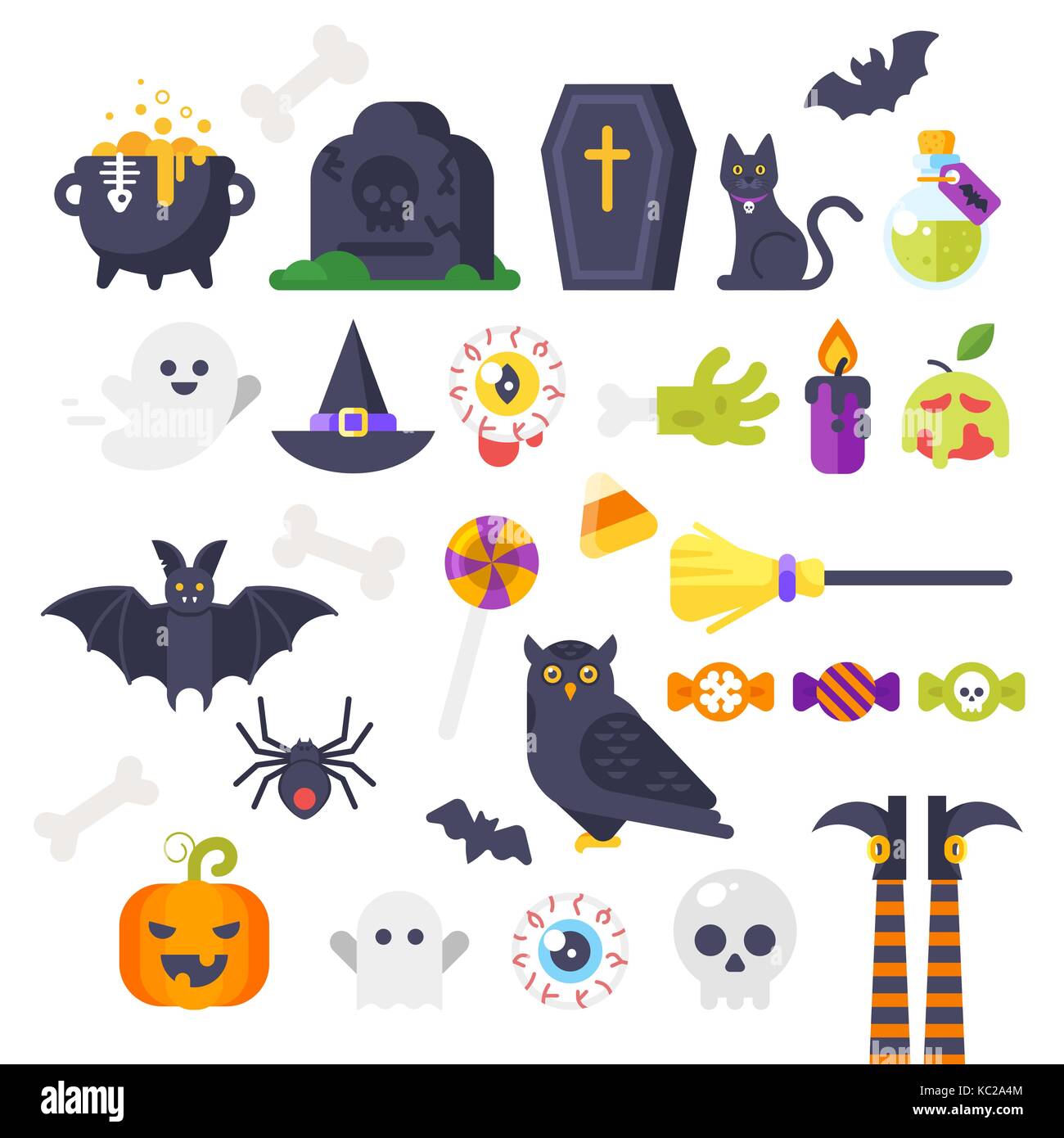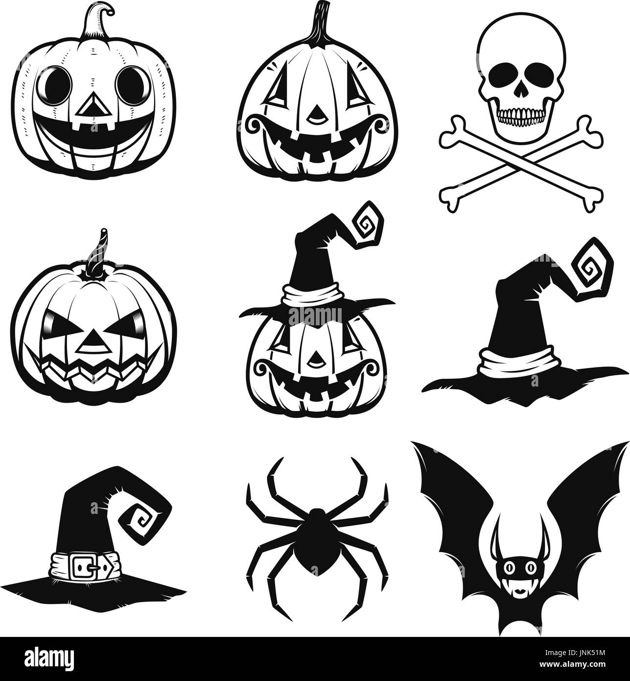 Conjunto de iconos de Halloween Halloween calabazas, murciélagos, arañas, bruja hat, cráneo con huesos de elementos del diseño de carteles, tarjetas de felicitación. Ilustración vectorial Imagen Vector de stock - Alamy