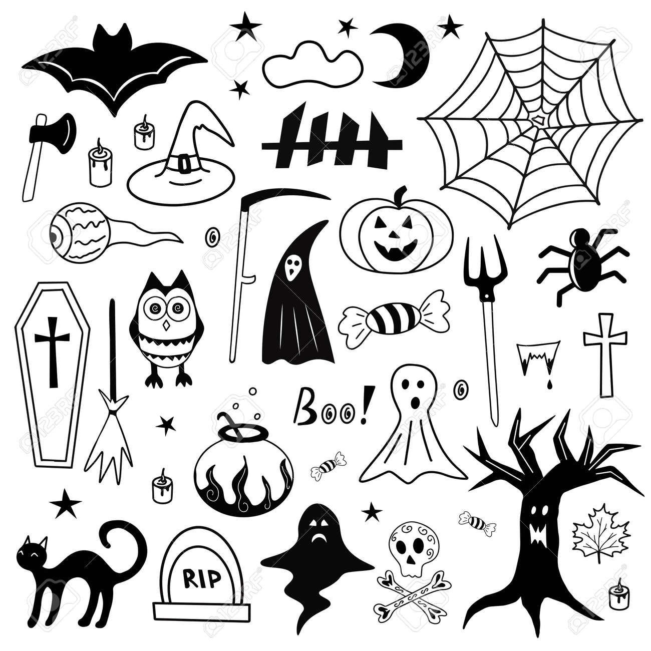 Conjunto De Iconos De Halloween Para La Decoración . Halloween Colorido Ilustración Vectorial Boceto . Ilustraciones svg, vectoriales, clip art vectorizado libre de derechos. Image 87909712