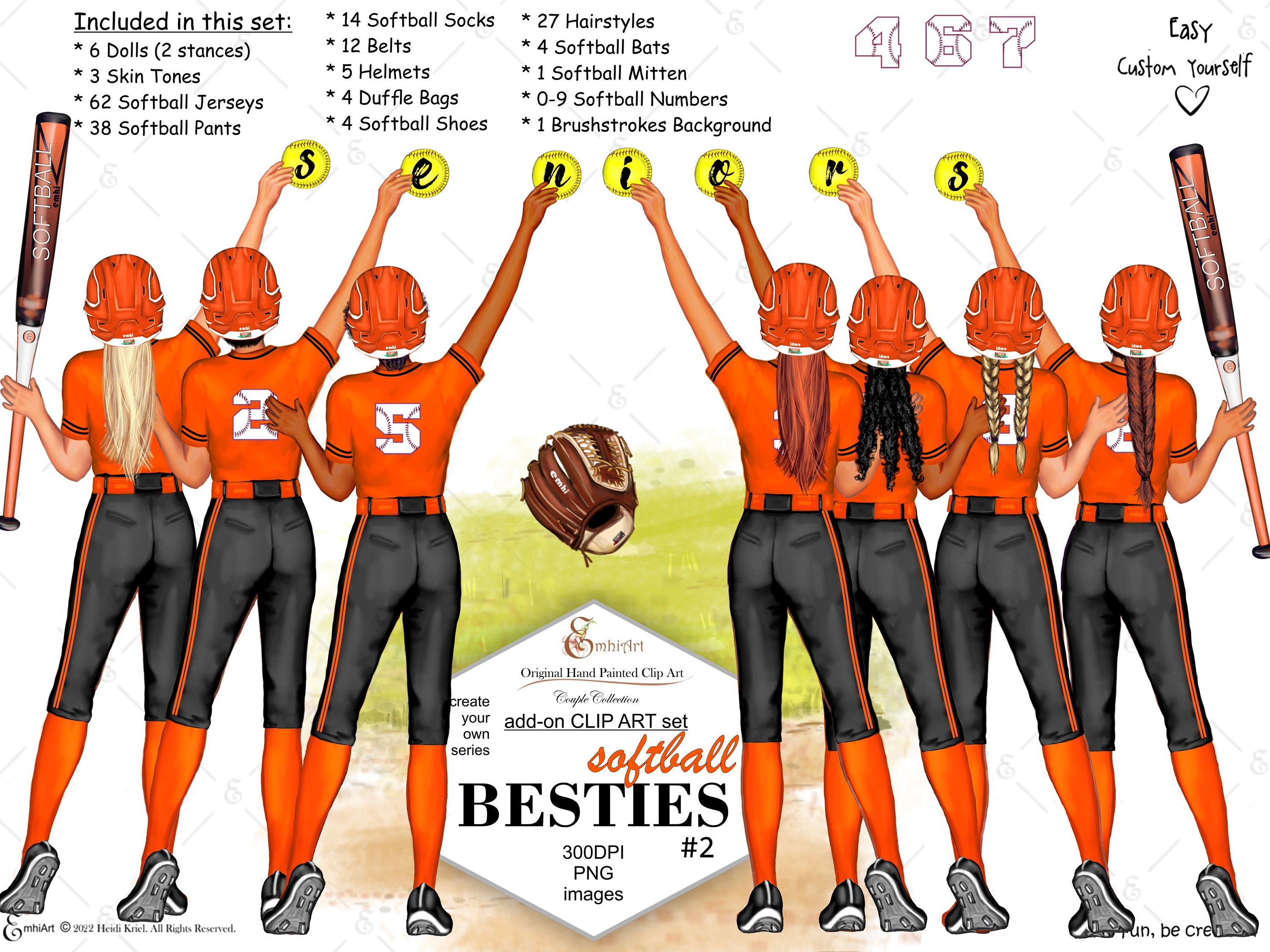 Paquete de imágenes prediseñadas personalizadas de Softbol de mejor amigo, piel y cabello personalizados, moda de softbol. Naranja, amarillo, púrpura, rosa, murciélagos, bolas, números.BFF.Besties - Etsy México