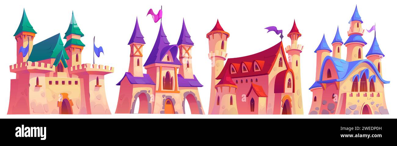 Conjunto de vectores de dibujos animados de castillo de princesa rosa de cuento de hadas torre mundial de reino de cuento de hadas mágico para historia infantil de fantasía arquitectura de mansión