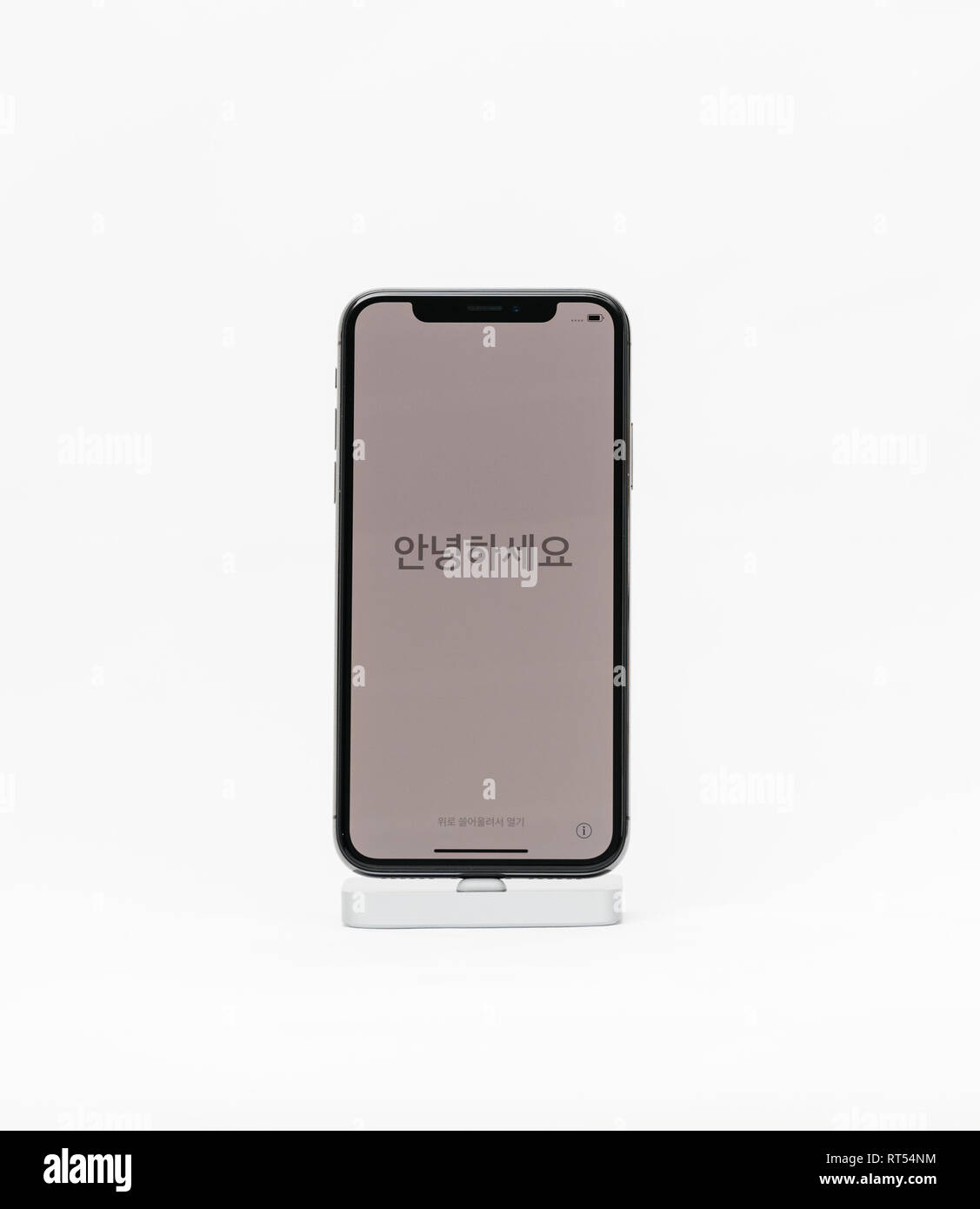 París, Francia - Nov 5, 2017: Nueva Apple iPhone X 10 aislados con fondo blanco en la pantalla la palabra Hello en idioma Coreano - primero ejecutar instalación Fotografía de stock - Alamy
