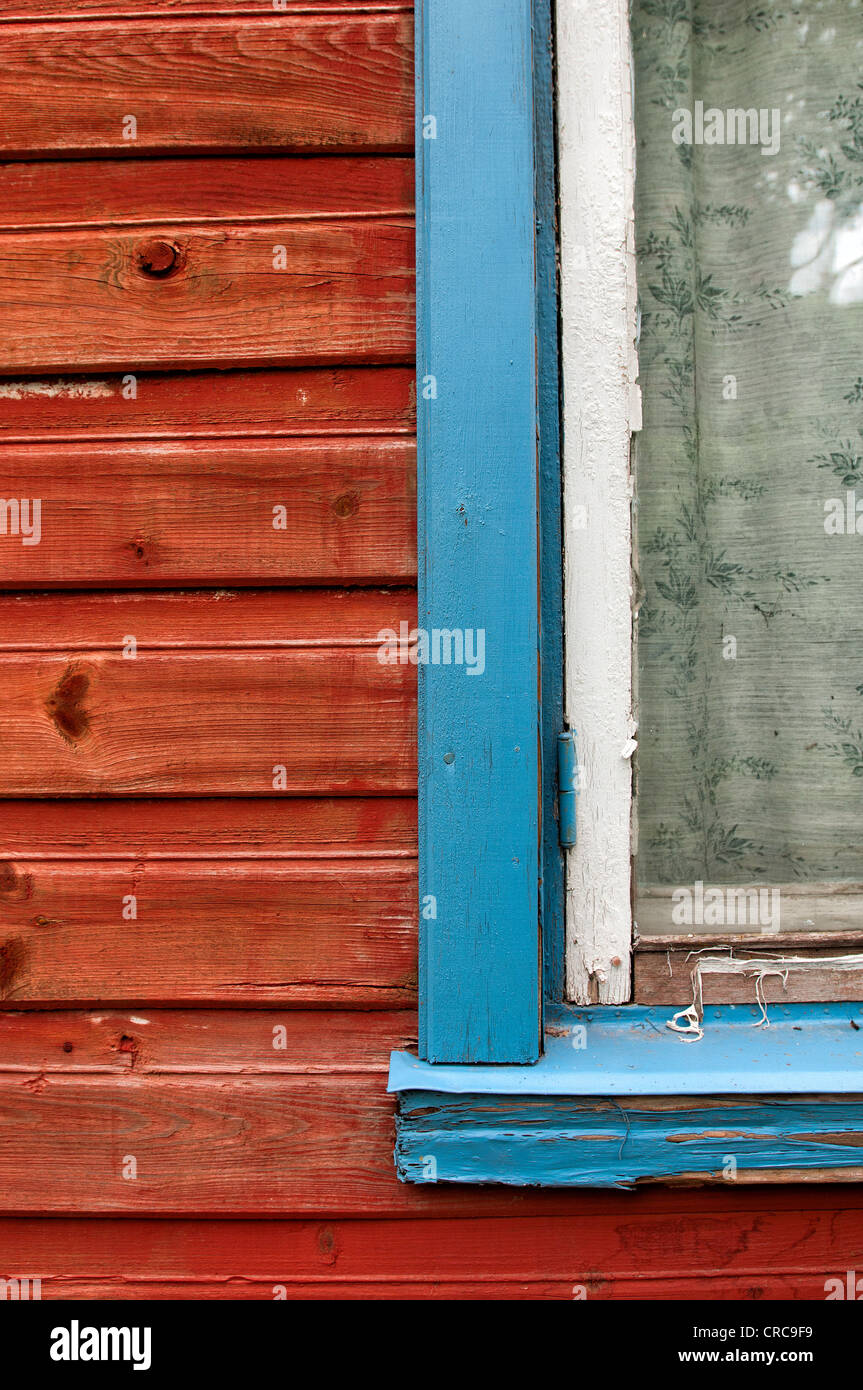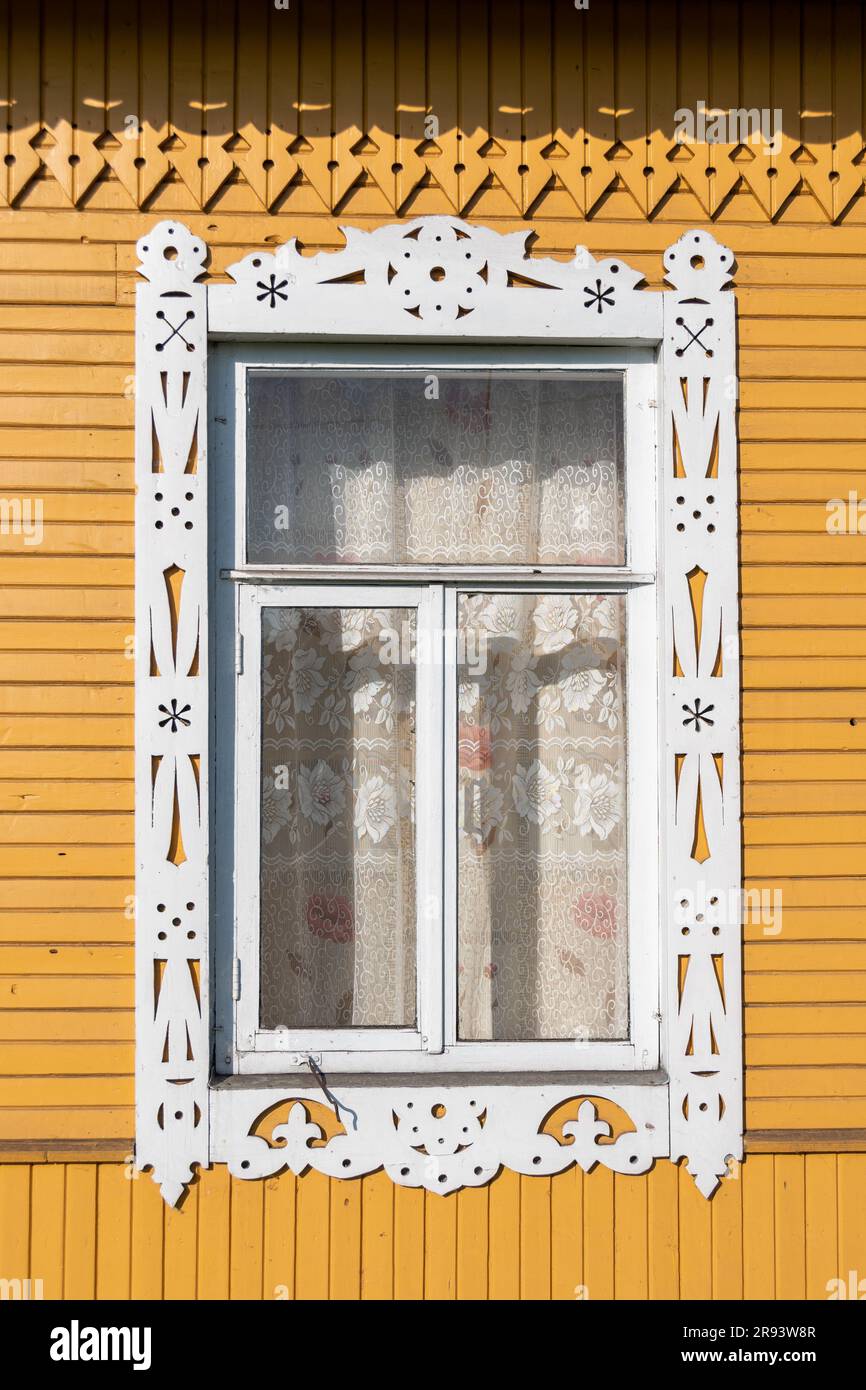 Primer plano de una ventana enmarcada con una jamba de madera tallada en blanco decorada con patrones blancos tradicionales fuera de un isba ruso azul Fotografía de stock - Alamy