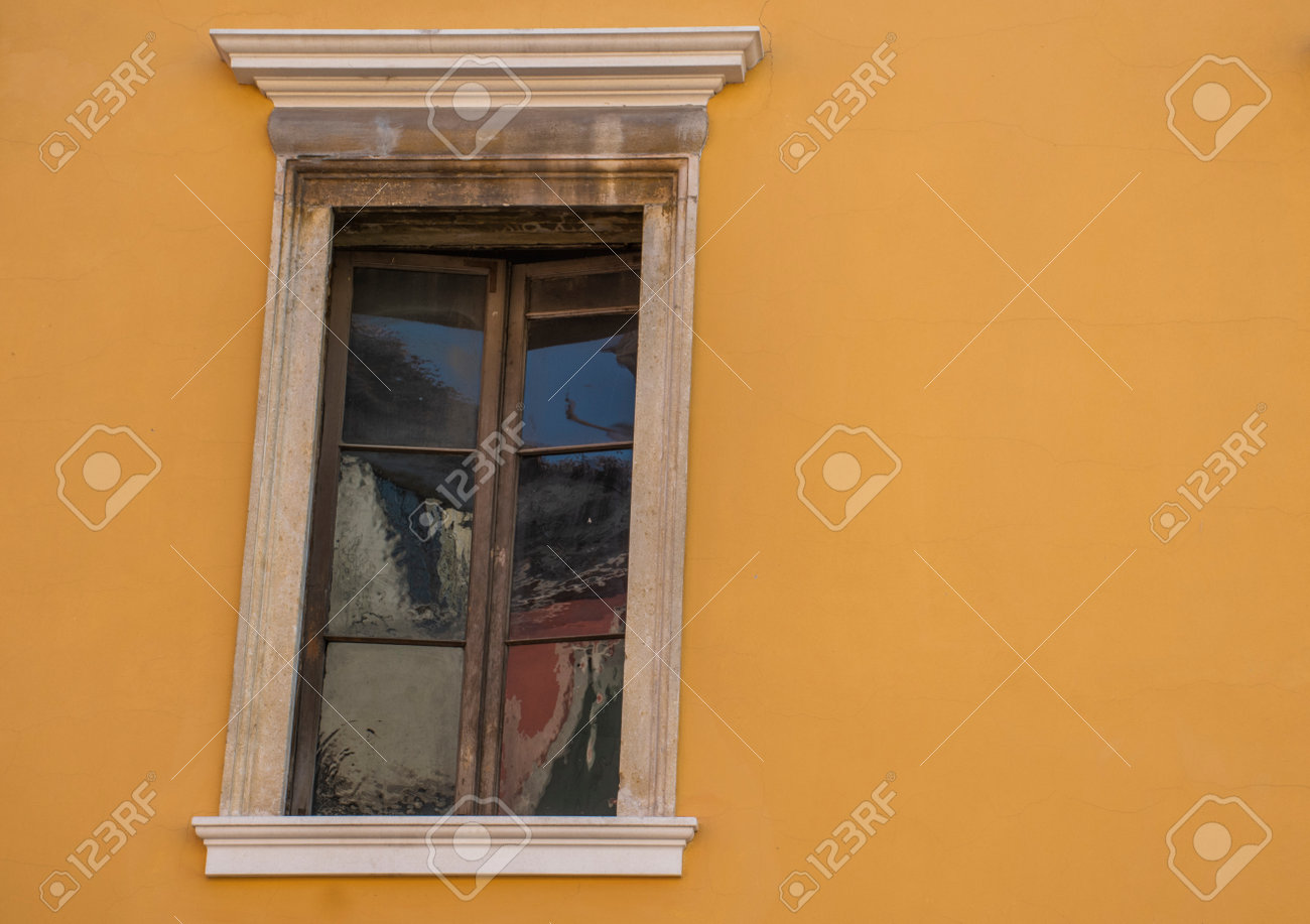 Ventana Entreabierta Con Vidrio Antiguo En La Pared Ocre Y Jamba De Mármol Fotos, retratos, imágenes y fotografía de archivo libres de derecho. Image 147011802