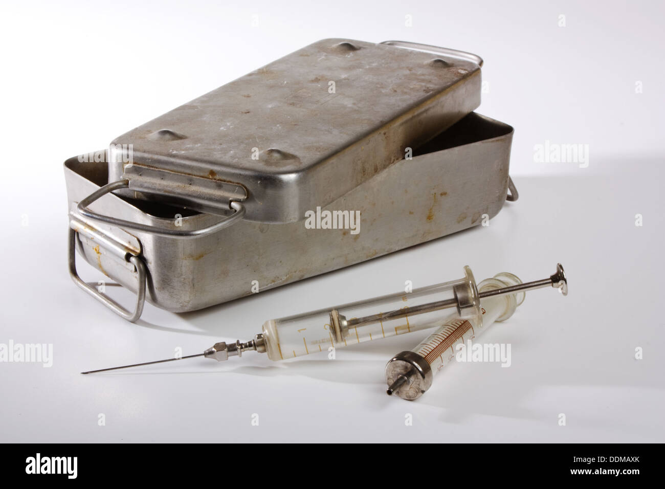 Old medical syringes and a metal box Stock Photo - Alamy
