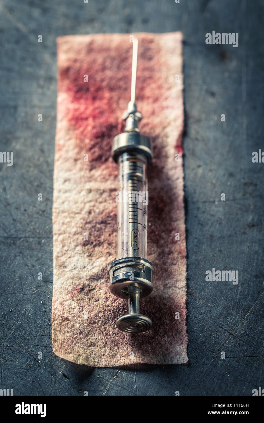 Jeringa médica antigua hecha de cristal y metal con sangre Fotografía de stock - Alamy