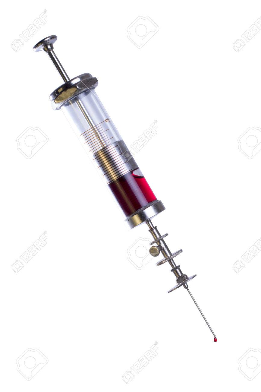 Jeringa De Época Antigua Con La Sangre, Aislado En Blanco Fotos, retratos, imágenes y fotografía de archivo libres de derecho. Image 43456852