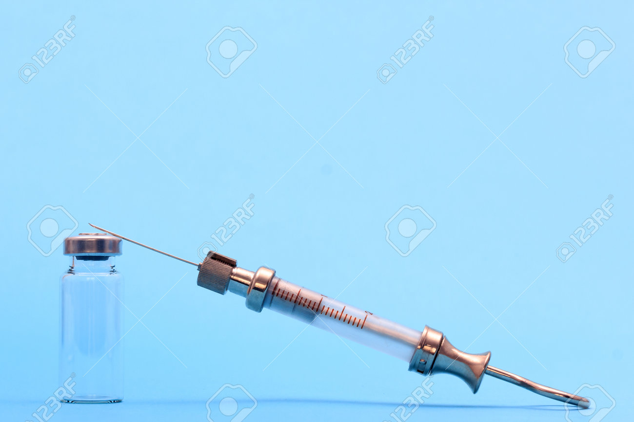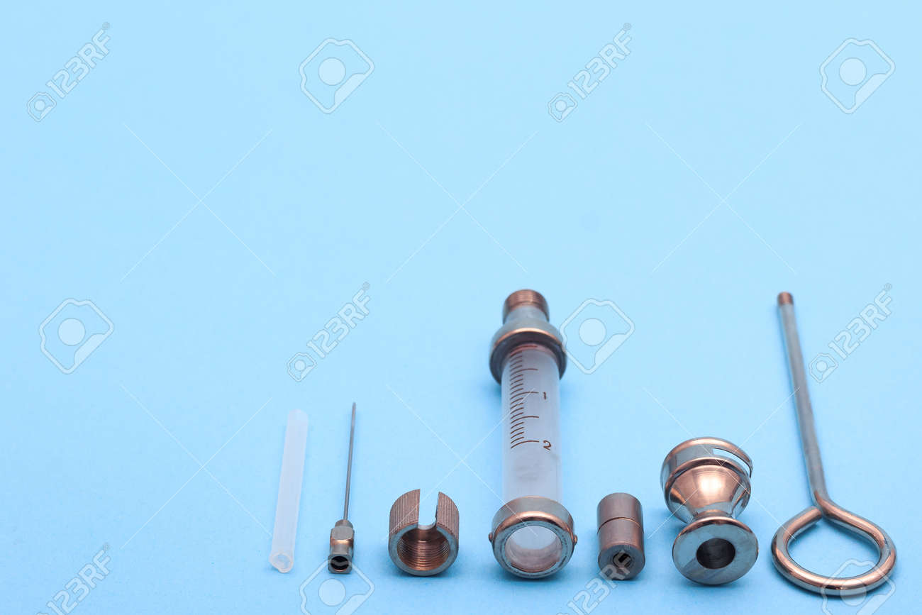 Jeringa Antigua Hecha De Metal Y Vidrio Sobre Fondo Azul. Espacio Libre Para Texto. Espacio De Copia Foto de archivo - Imagen de medicina, enfermedad: 183785550