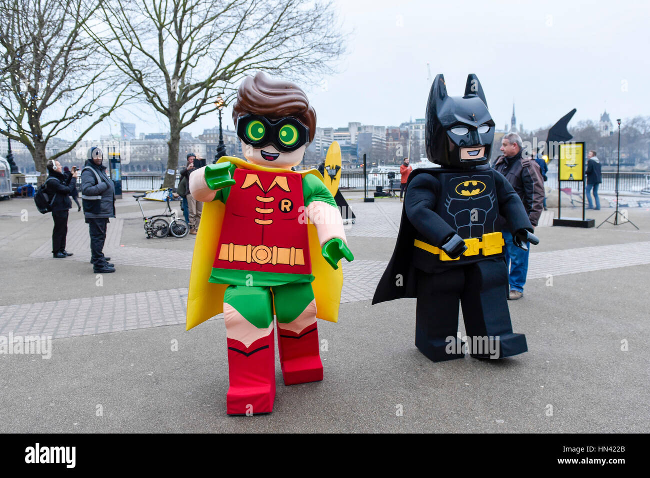 London, UK. 8th Feb, 2017. LEGO Batman and Robin costumed characters after posing with a giant LEGO Batarang, which has crash landed at Observation Point on the South Bank. Created to celebrate
