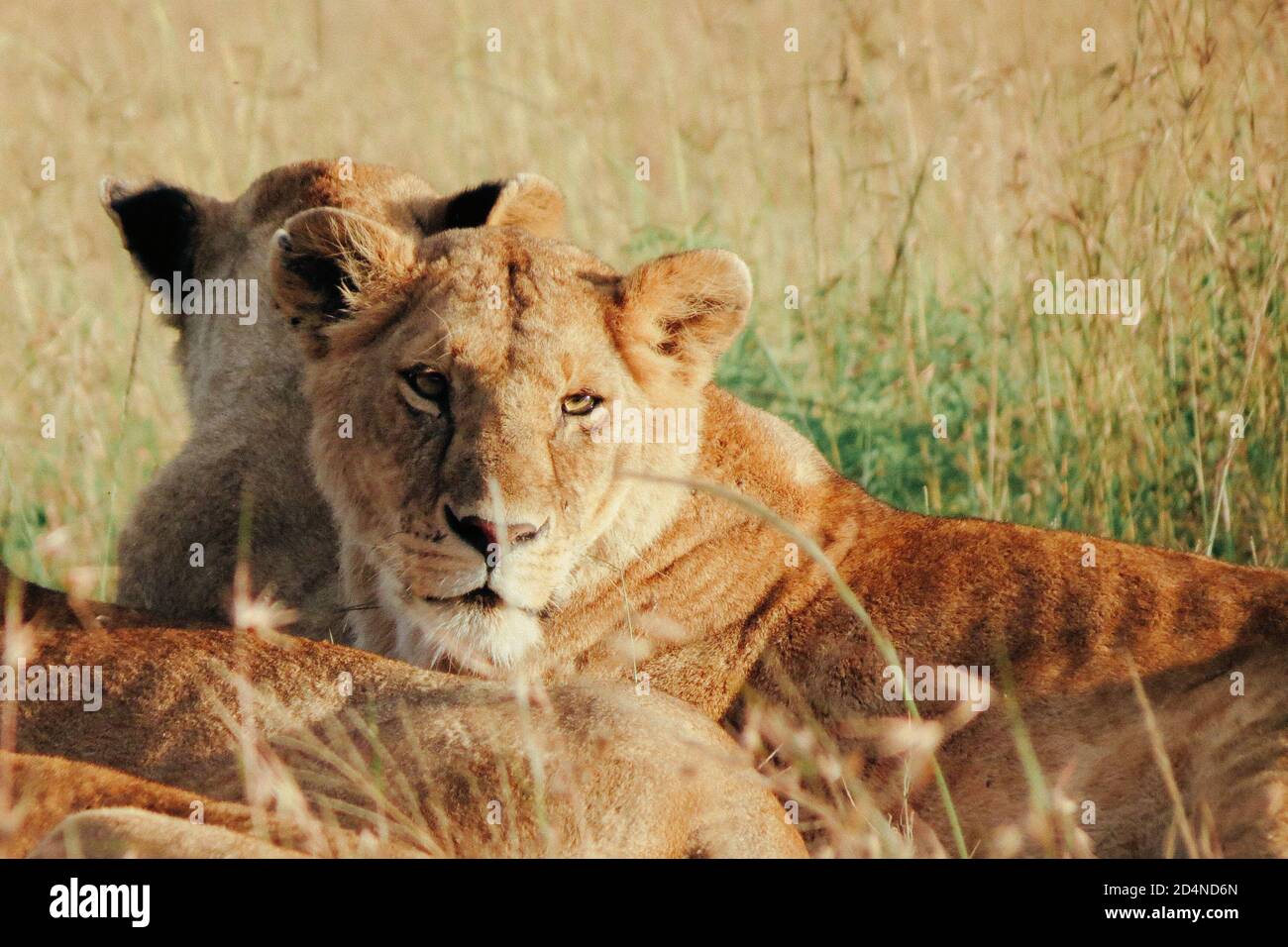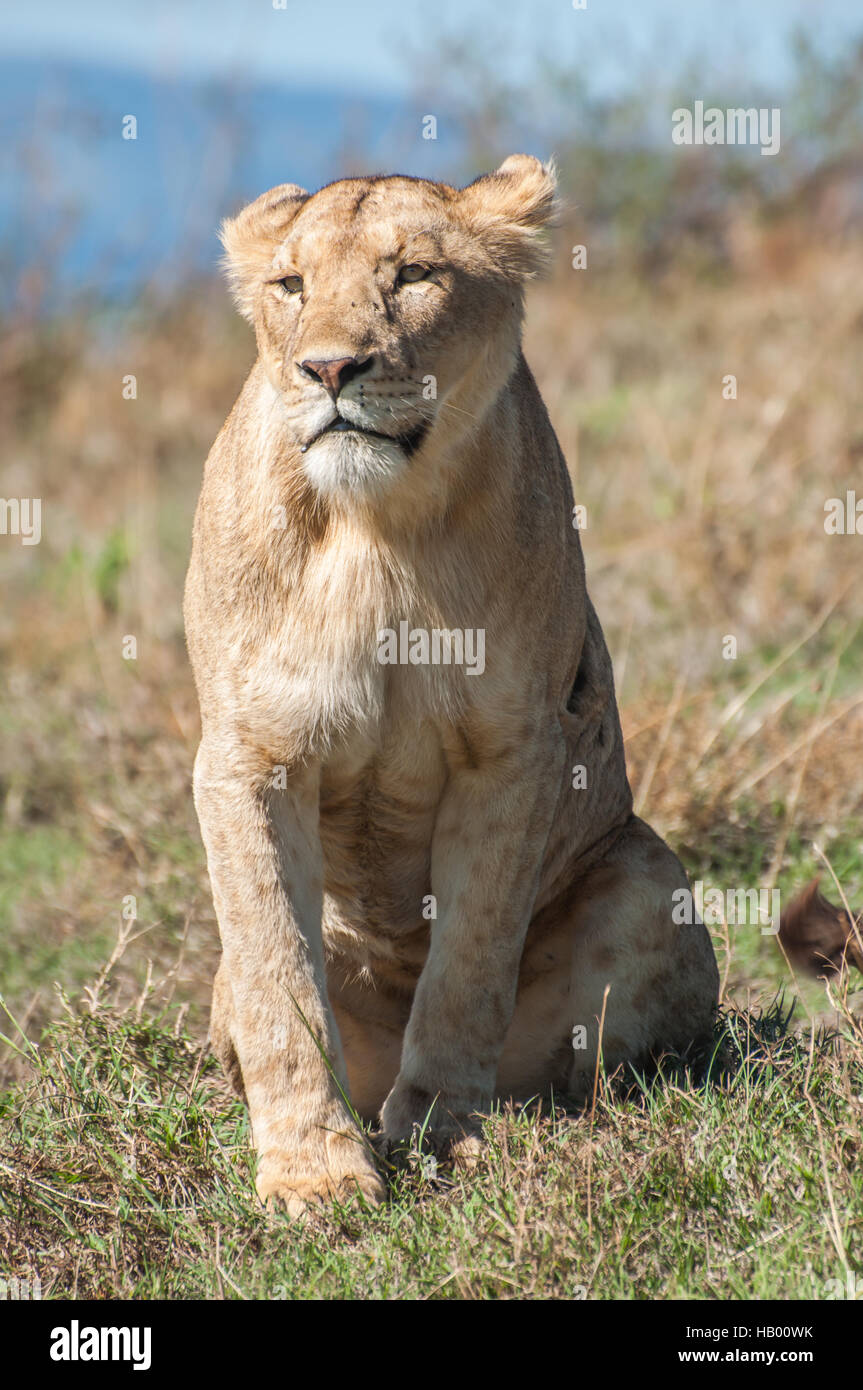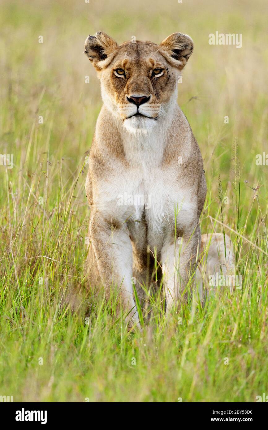 Lion (Panthera leo), lioness sitting on grass, looking toward camera, Kenya, Masai Mara National Park Stock Photo - Alamy