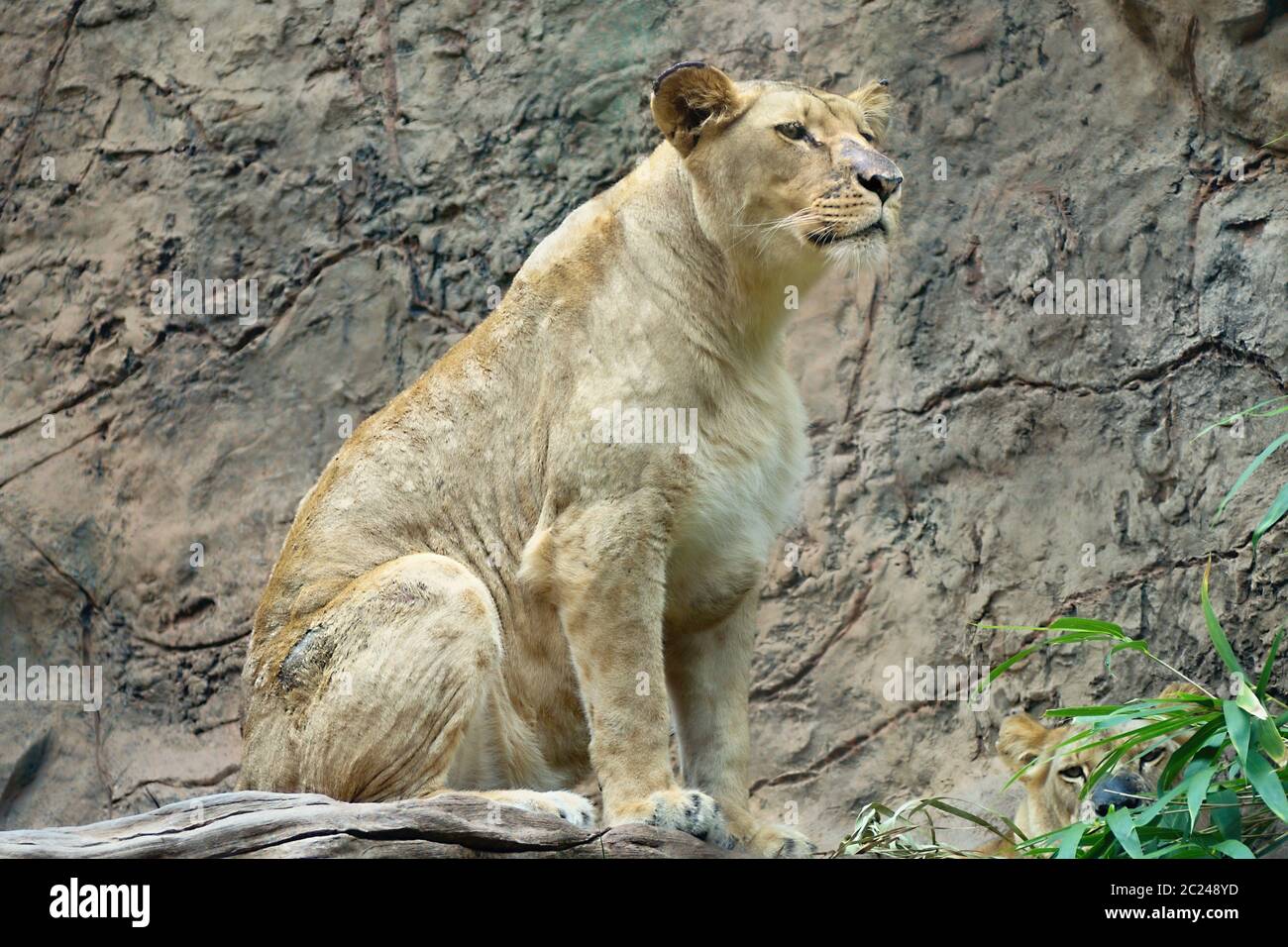 Cierre de una Leona, sentada frente a una pared de roca gris. Ella mira, pero tranquilamente en la distancia, de cerca en el perfil lateral Fotografía de stock - Alamy