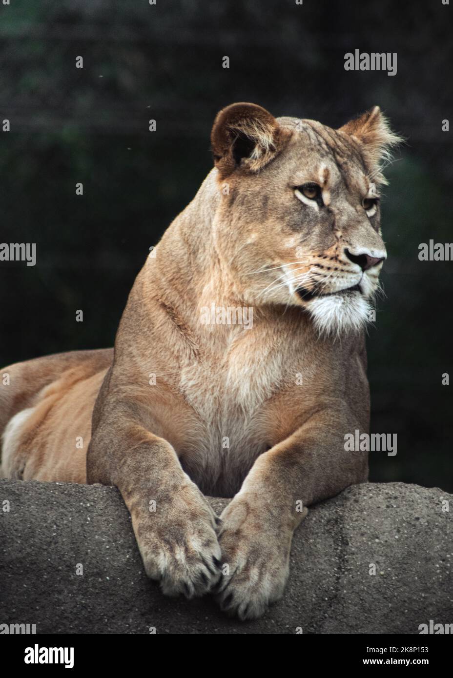 Primer plano vertical de una leona sentada sobre la piedra con fondo oscuro y borroso Fotografía de stock - Alamy
