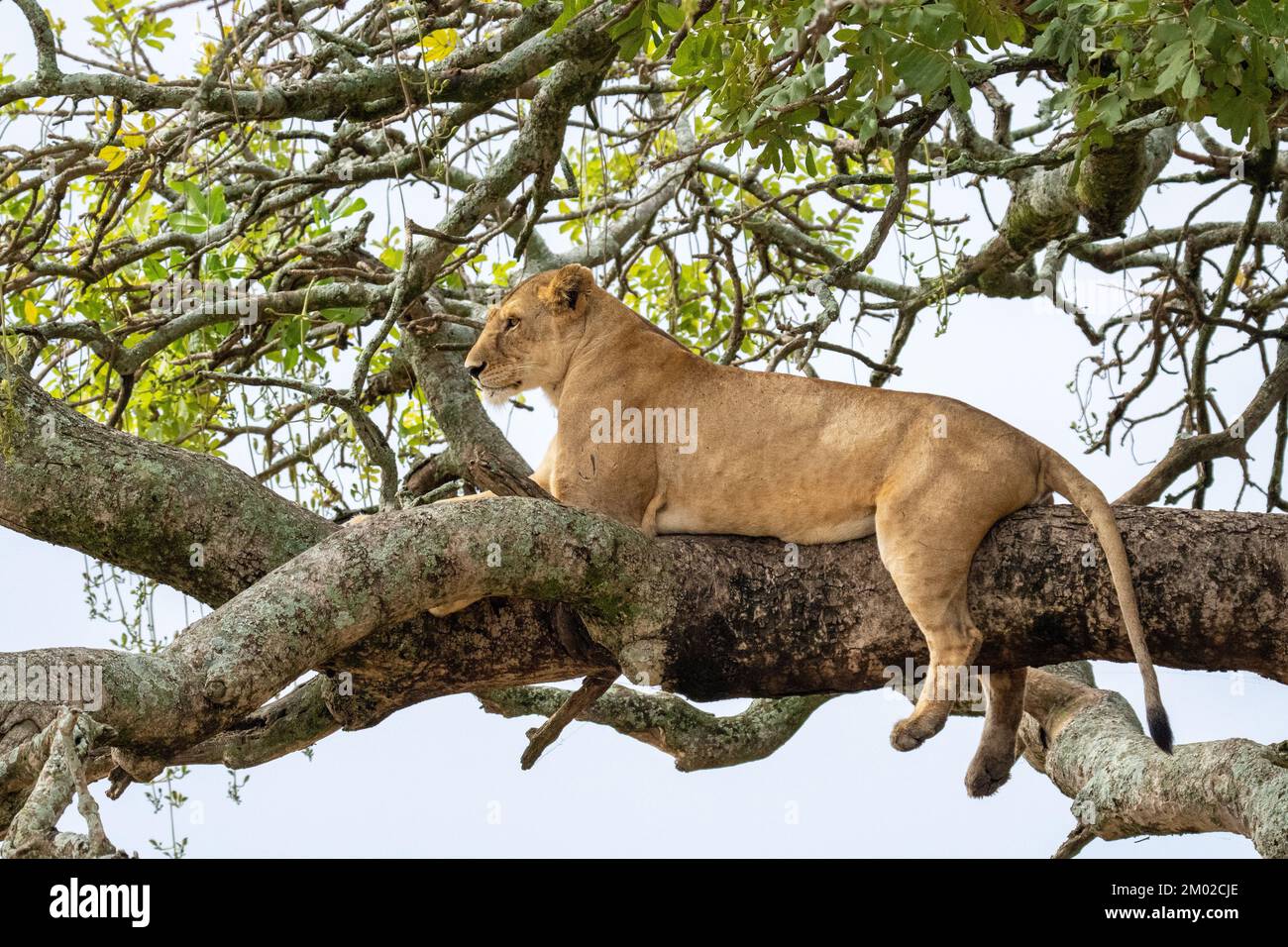 La leona está sentada sobre un árbol Fotografía de stock - Alamy